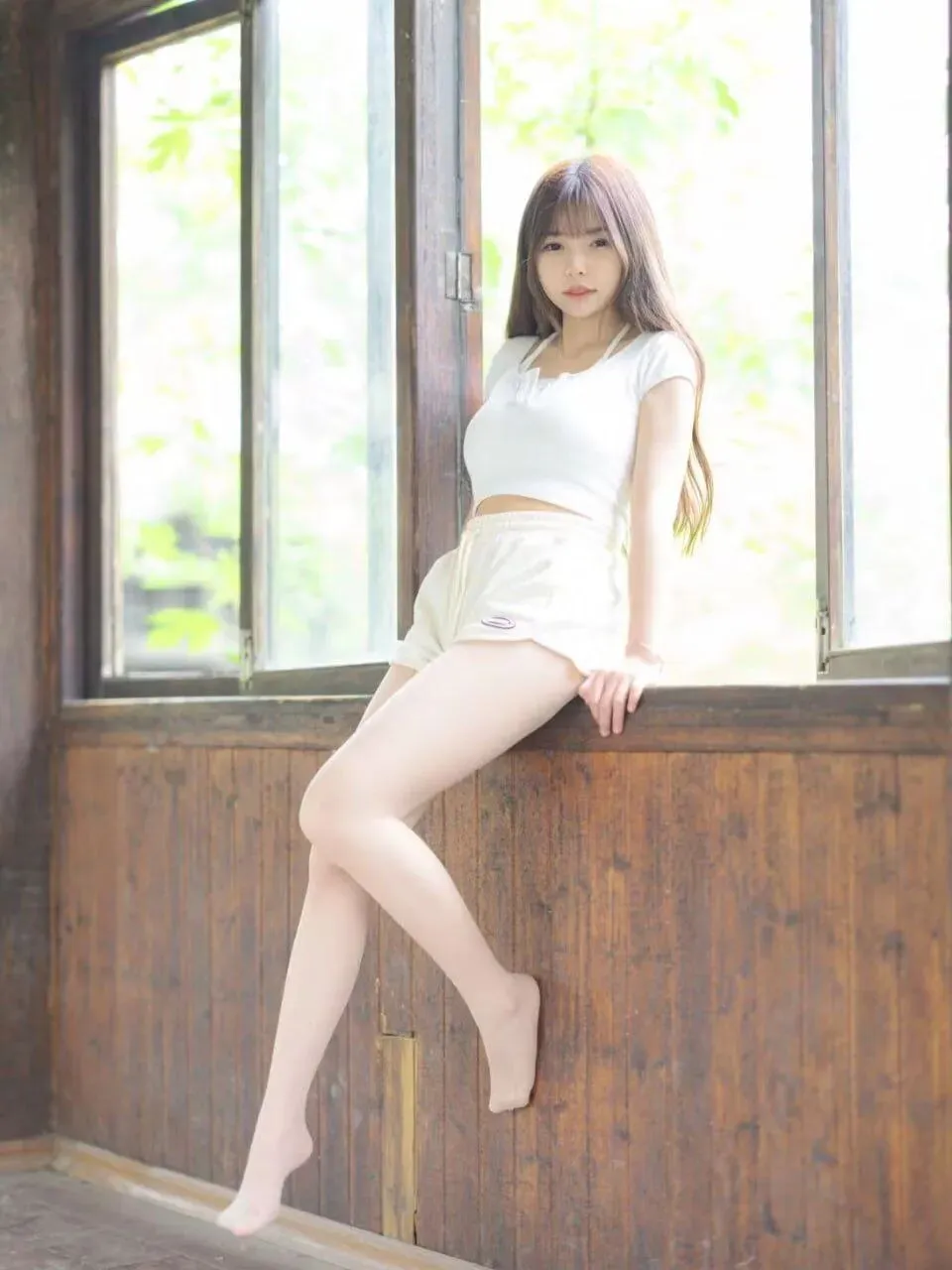 - 白色短袖+白色短裤+肉色丝袜+白色凉鞋,整体色调统一,清新自然;