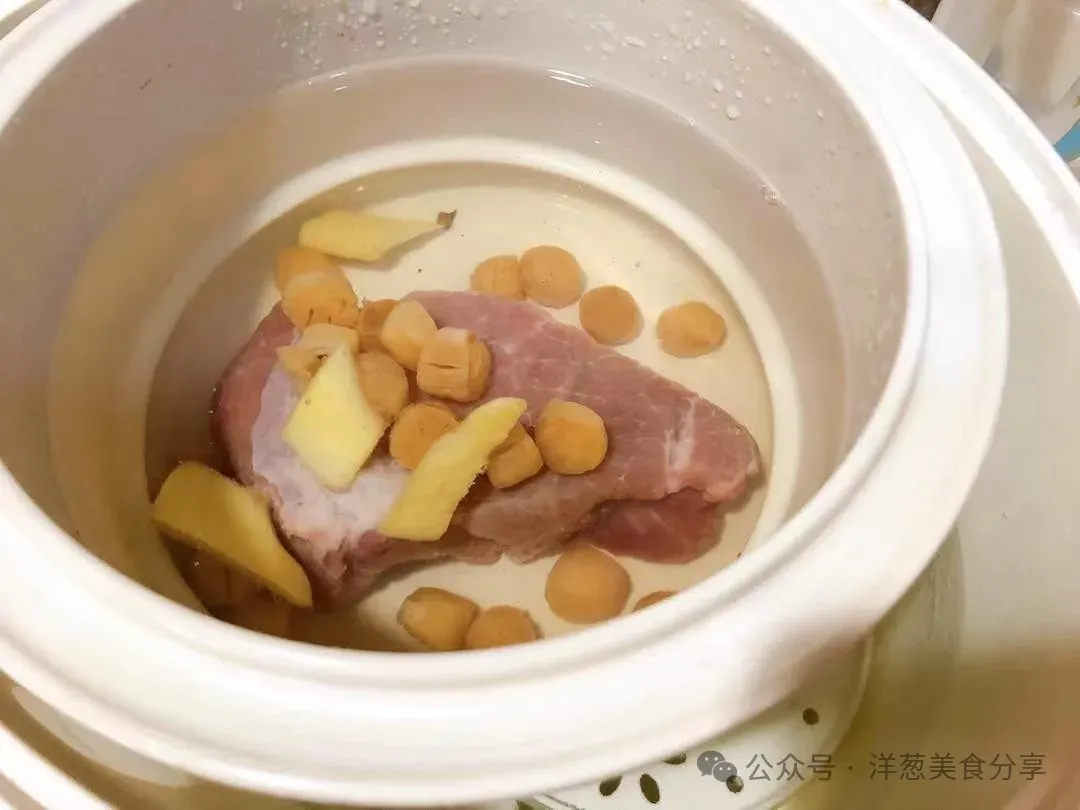 炖盅里首先放入姜片、瘦肉、干贝