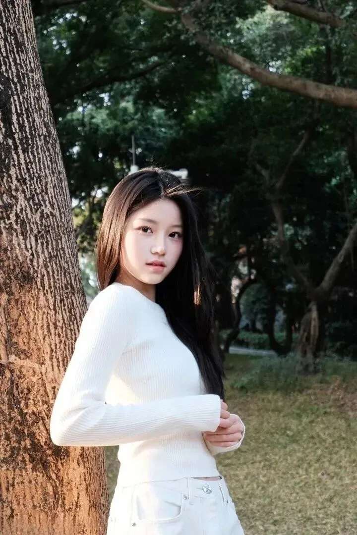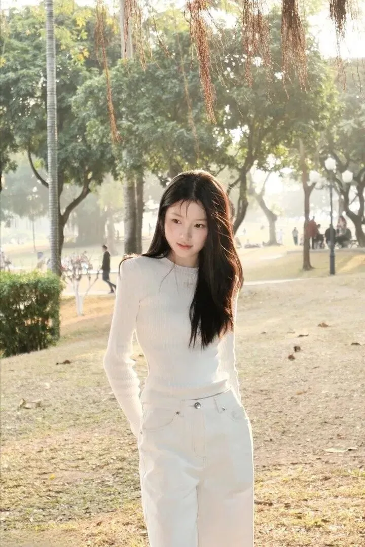 穿得温柔一点的话,这套长款针织衫就非常合适。同样是米白色上衣,但是长度到臀部以下。圆领设计露出漂亮的锁骨很雅致。裤子为米白色高腰阔腿裤,将腰线高高提起,使腿部看起来比实际要长出十厘米。全身一个颜色,简单却高级。小姐姐双手背在身后,站在树下笑的模样就宛如童话里的公主。