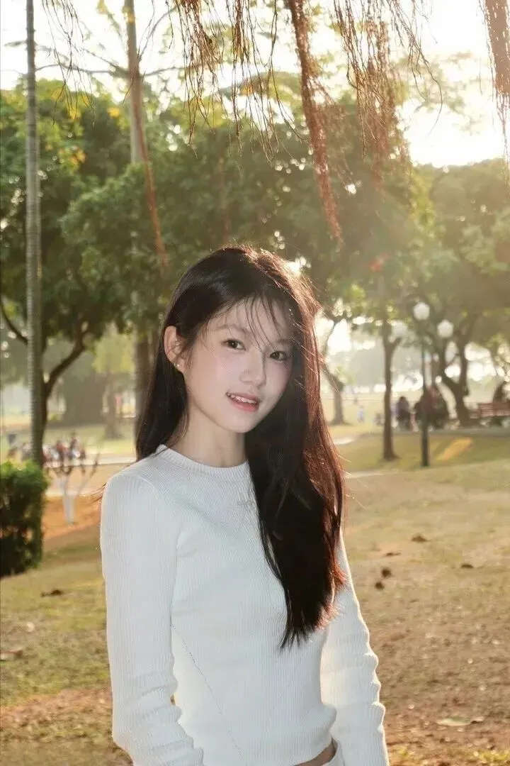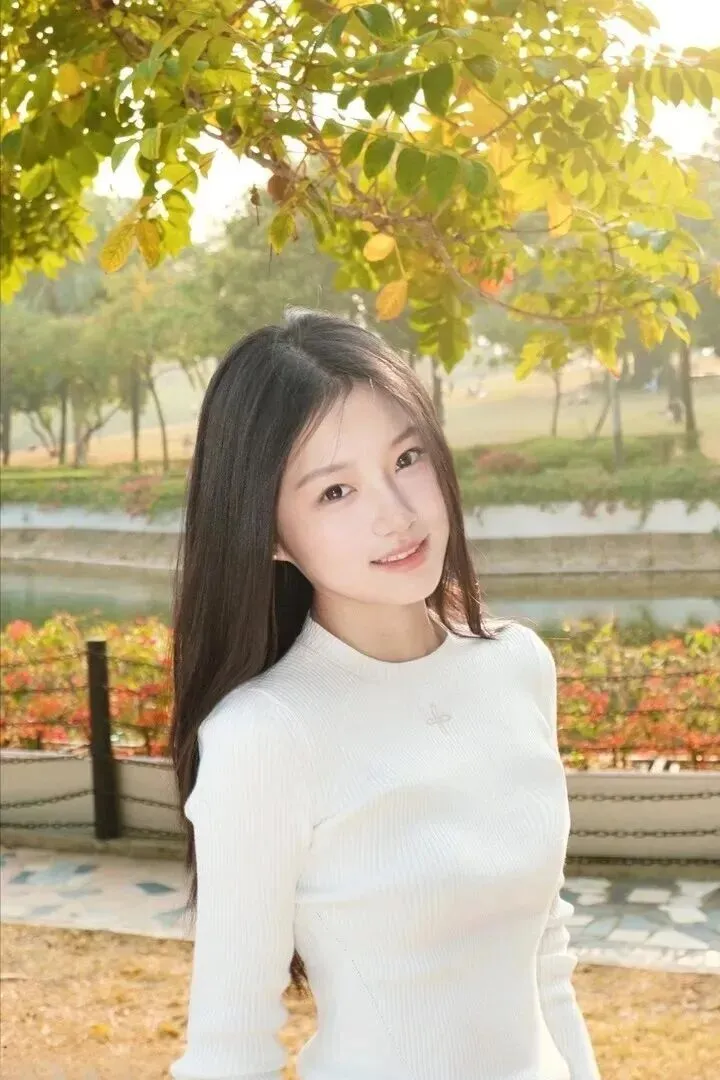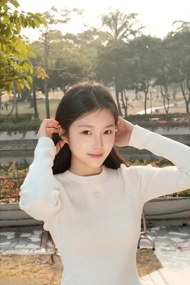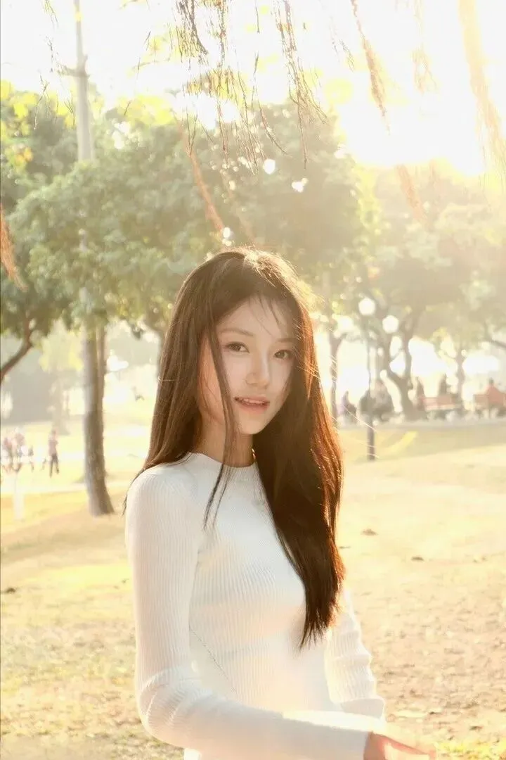 双手交叉在胸前,很文静。长袖的圆领针织衫勾勒出纤细的身体,身体略向左倾。那神态清丽自然就像是从画中走出一位仙女一样。柔和阳光打在了背景之上变得模糊了,更加突出她那柔美的身影。