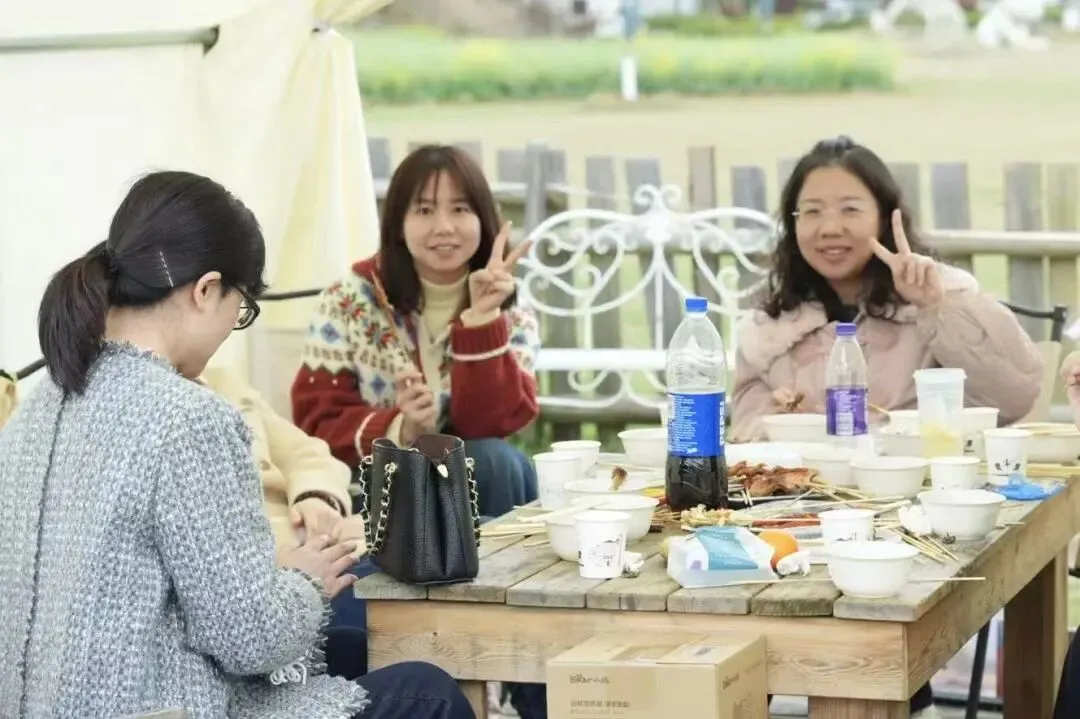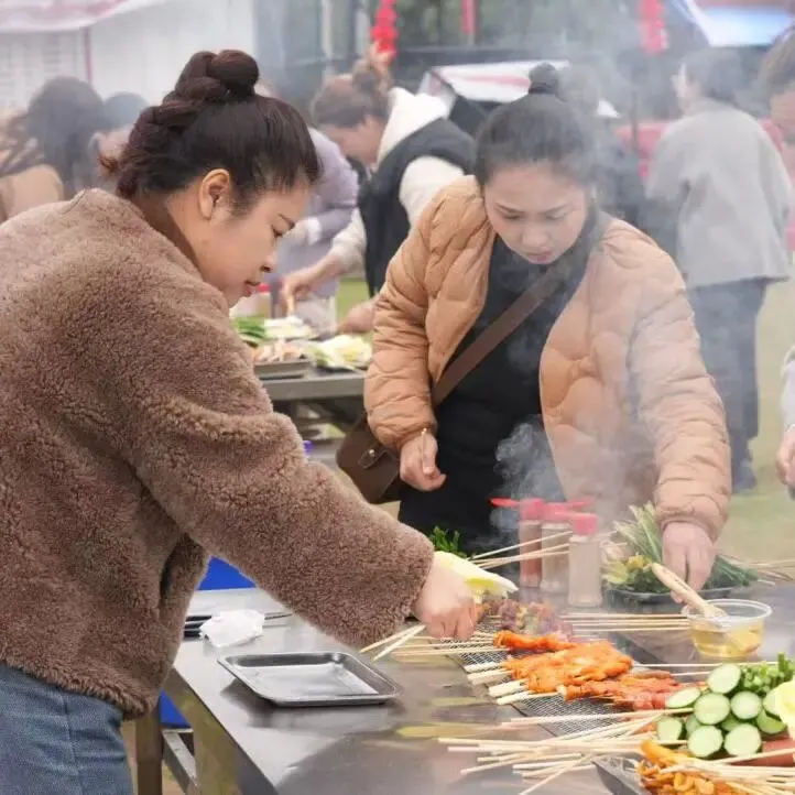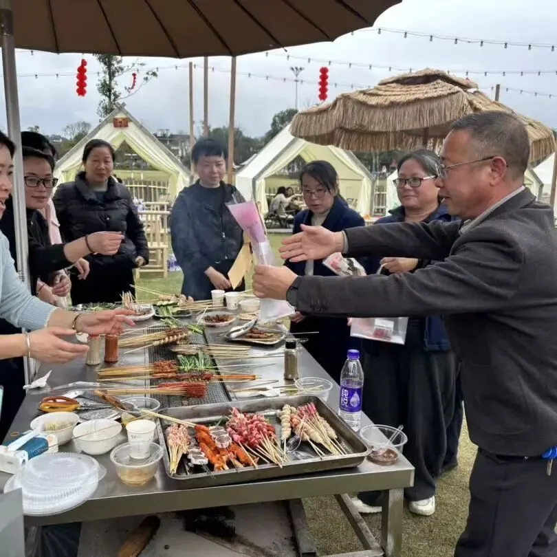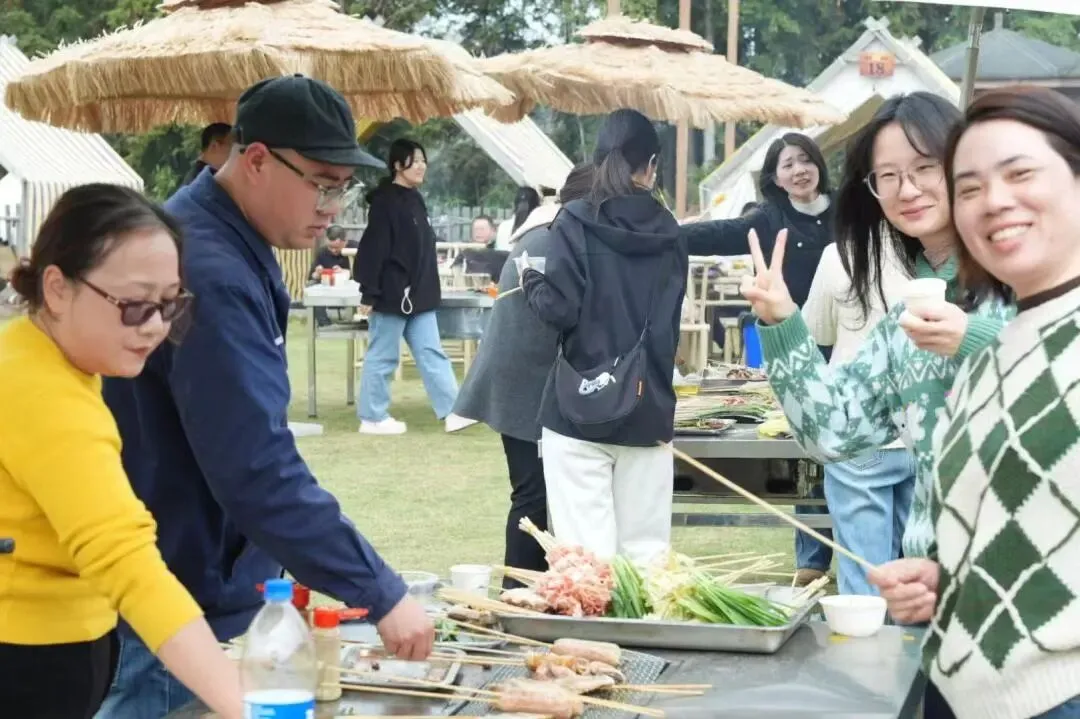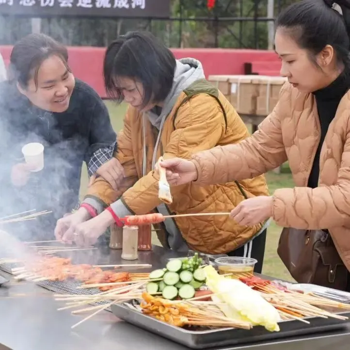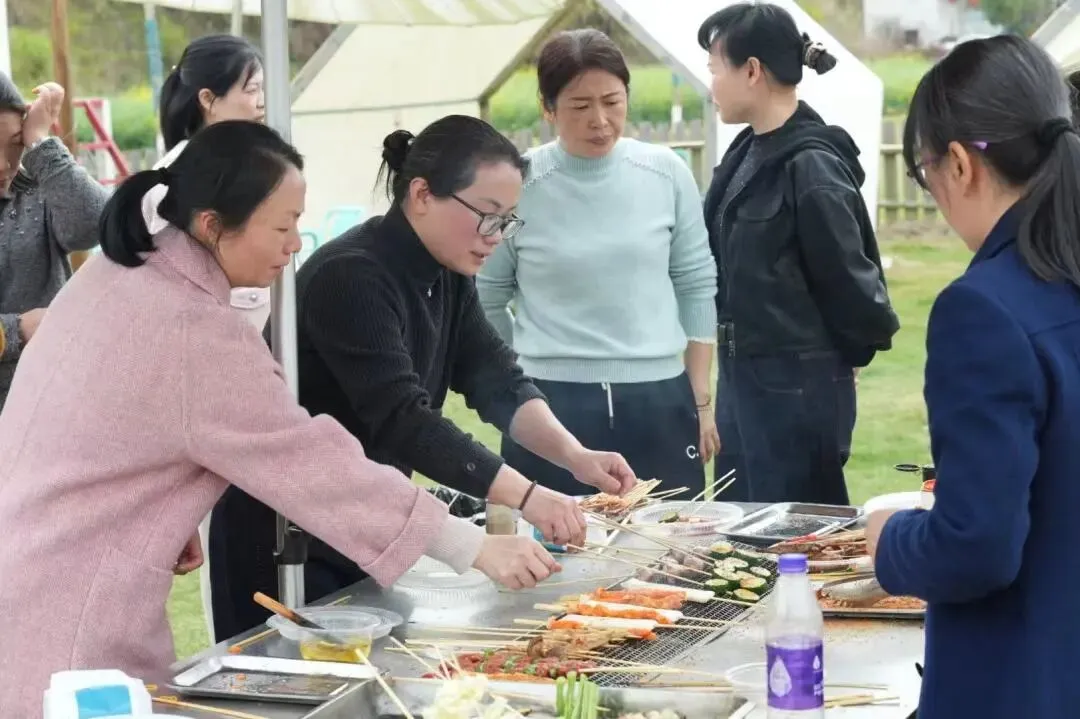 活动现场春意盎然,花香四溢。热闹的自助烧烤环节拉开欢乐序幕,大家围炉而坐,分工协作、各显身手,炭火滋滋作响,食材香气弥漫,在烟火气中畅谈生活、分享喜悦,田园间满是欢声笑语。
