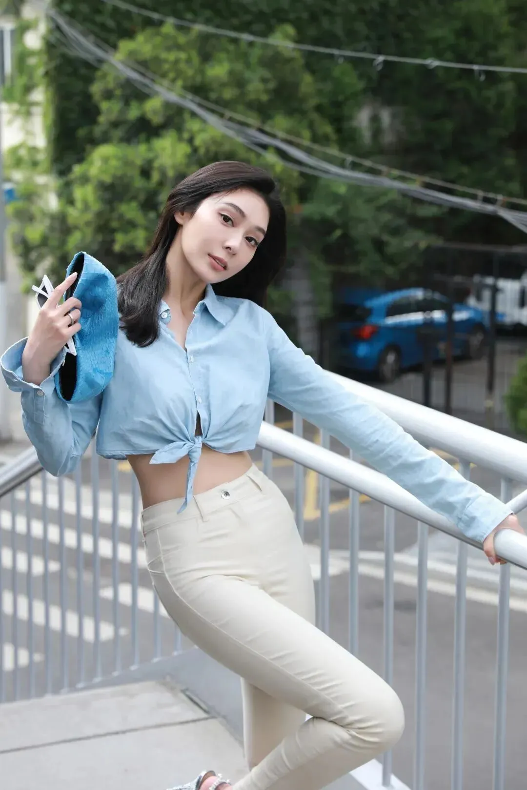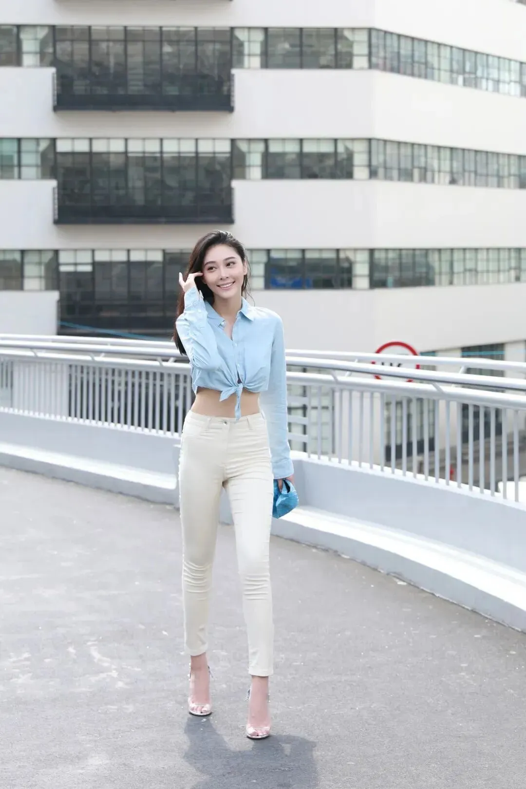 全身照更能体现细节。衬衫为牛仔质感的浅蓝色,腰间一个简单的系带结未完全系好,留有少许裸露的腹部,既不会过于张扬也不会太过低调。高腰牛仔裤版型好,腿部看起来有一米八。鞋子是字带银色细高跟,透明鞋面把脚踝变得纤细。她在步道上笑得最甜蜜的时候,她的身体以及心都是充满活力的。无论是通勤见客户还是约会下午茶,都能轻松驾驭,实用又赏心悦目。
