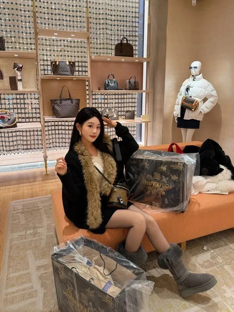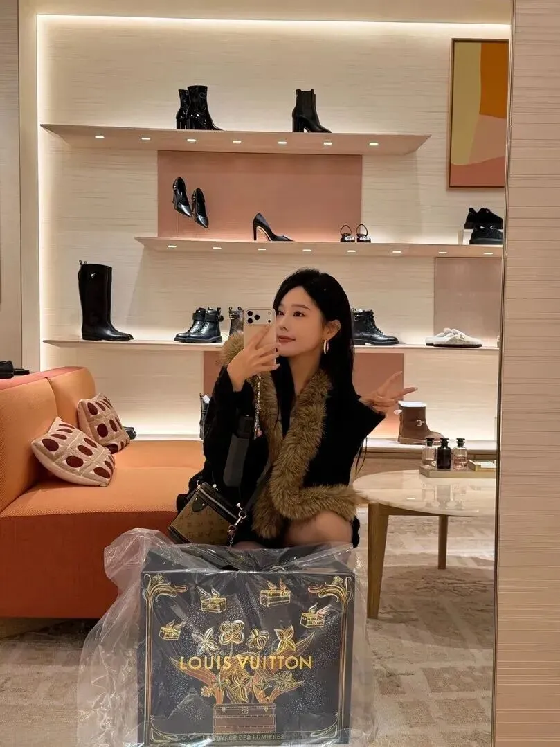 先来看图一。小姐姐坐在鞋店里的一角,黑色的外套一下把人吸引了过去。浅棕色毛领十分柔软,整体有一种质感的展现感。秋冬季节它是最能保暖、最有气质的衣饰。穿肉色丝袜时露出了两条长腿,这样的若有若无非常迷人,甜辣兼具的双重魅力使人无法离开视线。拿着剪子比个剪刀手,很有些才气。最绝的是身后那一只LV购物袋,虽然它没有开口,但是它好像在对全世界宣布:“又是一个收获满满的日子里!”