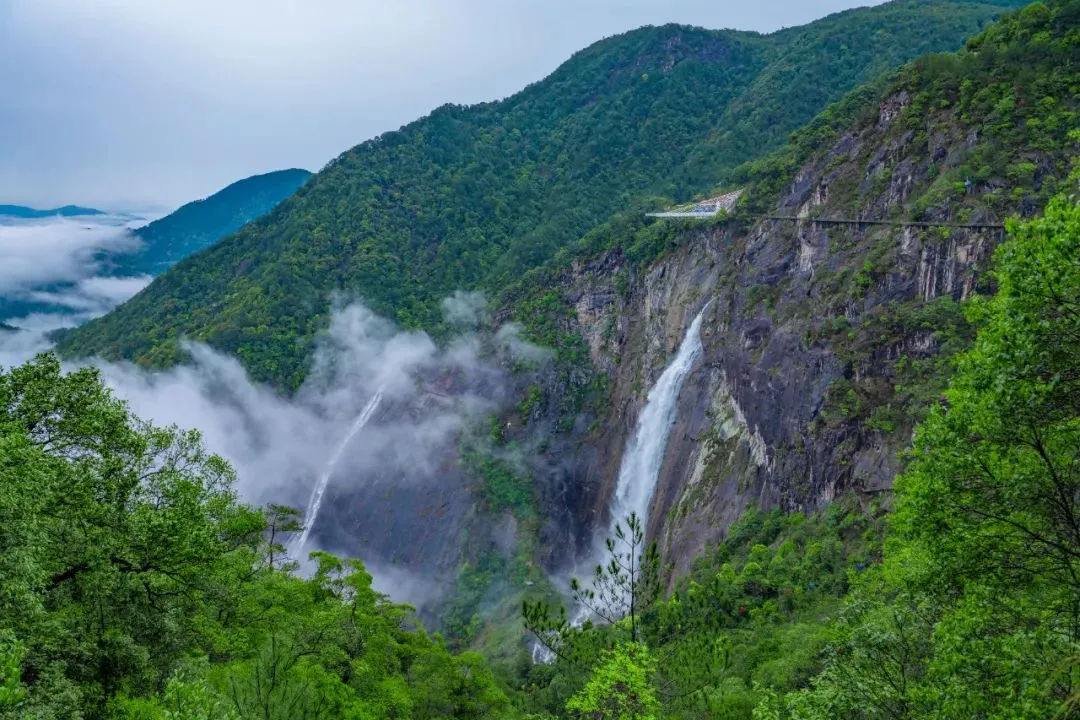 总落差314米,单级落差达184米,被誉为“华东第一瀑”,是国内难得一见的双瀑。由岱仙瀑布和油漏漈瀑布组成。不羁的溪水如烈马脱羁,雄浑奔放,气势非凡;西边的油漏漈瀑布高约120多米,宽110多米,瀑水依崖缓流,恰似珠帘下垂,温和婀娜。