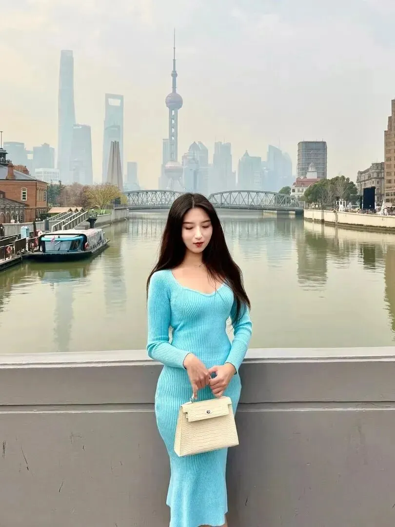 于是她就去了苏州河这边,在桥栏上静静地发呆。湖蓝色连衣裙搭配灰调背景更加白皙动人,修身高挑的身材被很好的表现出来。拎着米白包包,神态自然,背靠的是东方明珠和老建筑,水中的倒影也绝美!这样搭配简单却不单调,上海那种复古与现代结合的味道,都被她穿出了立体。