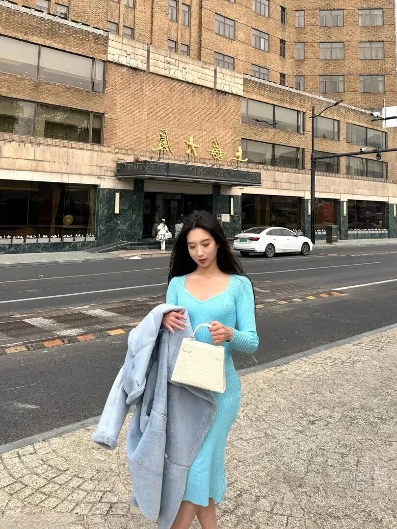 傍晚她穿着浅蓝色裙子在欧式老街走着。裙子紧身,曲线好看,外套搭在手臂上,随意得很。她笑着提着皮包的后面是复古建筑和红篷子,但是交通灯很潮。浅蓝要比湖蓝更日常一些,适合逛街,温柔不张扬。