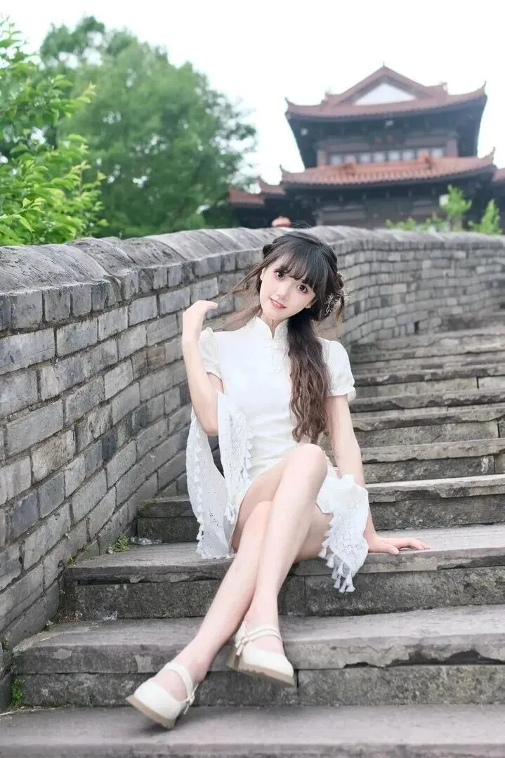 绝了!古城墙下白色旗袍女神的穿着美得让人忘记了时间!