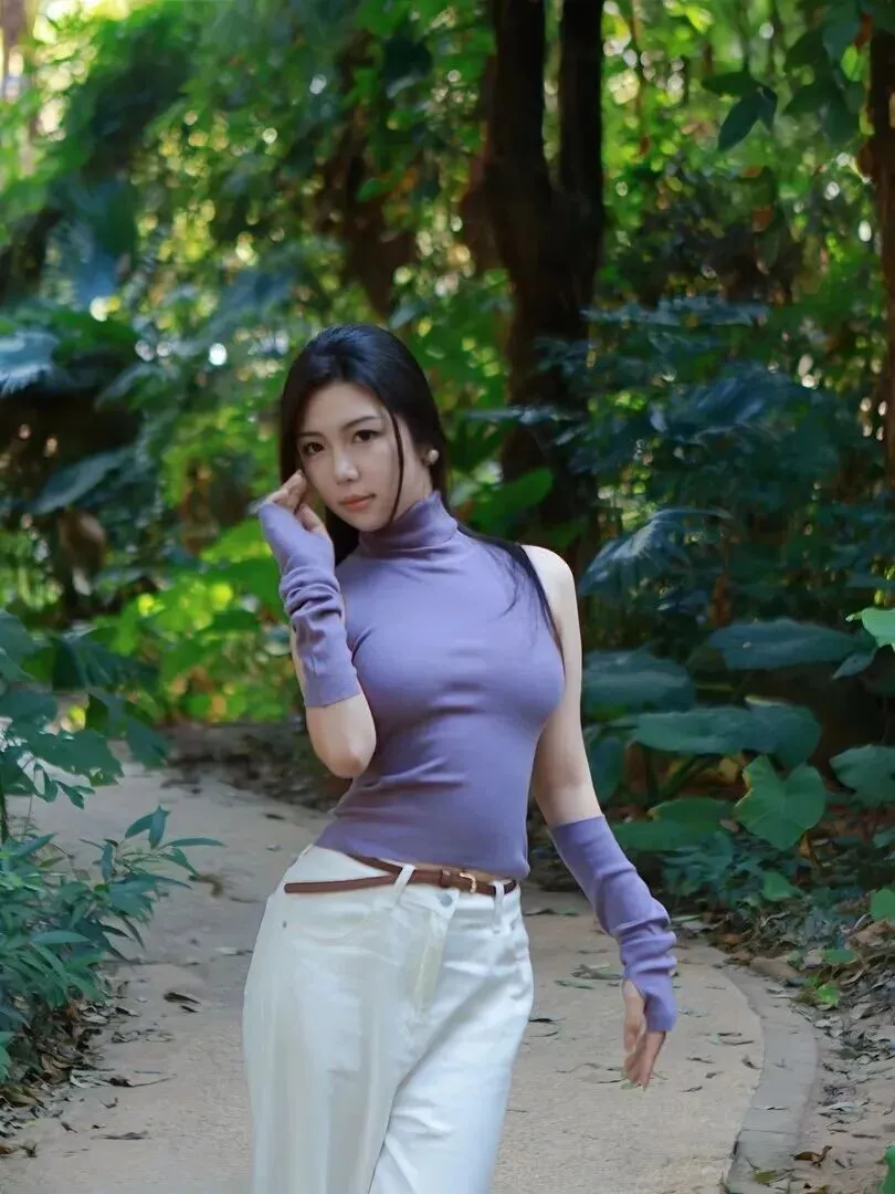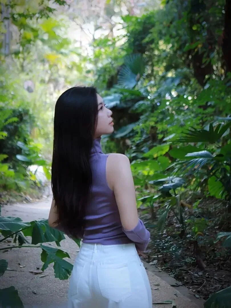 换上浅棕色长卷发就一下子有了慵懒的气息。淡紫色背心加长袖裤,着装得当无过紧情况。米白色休闲裤版型端正,后面设后袋。站在绿植中间,像雨林中走出的精灵一样,有着浓郁的仙气。