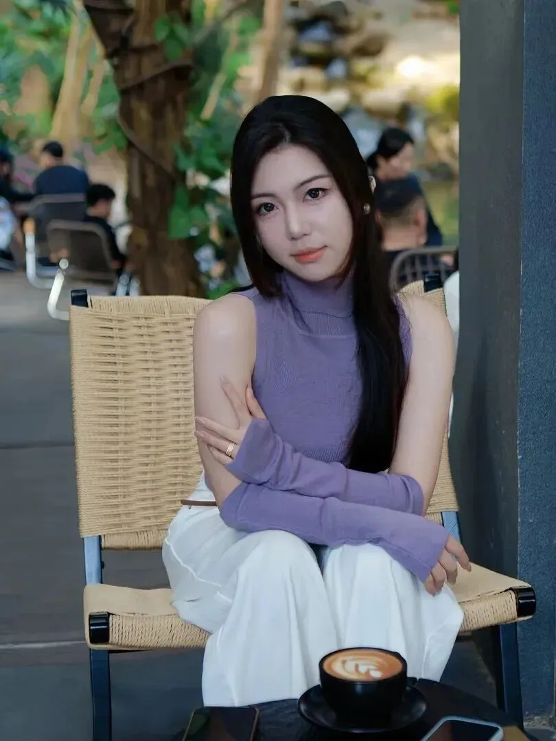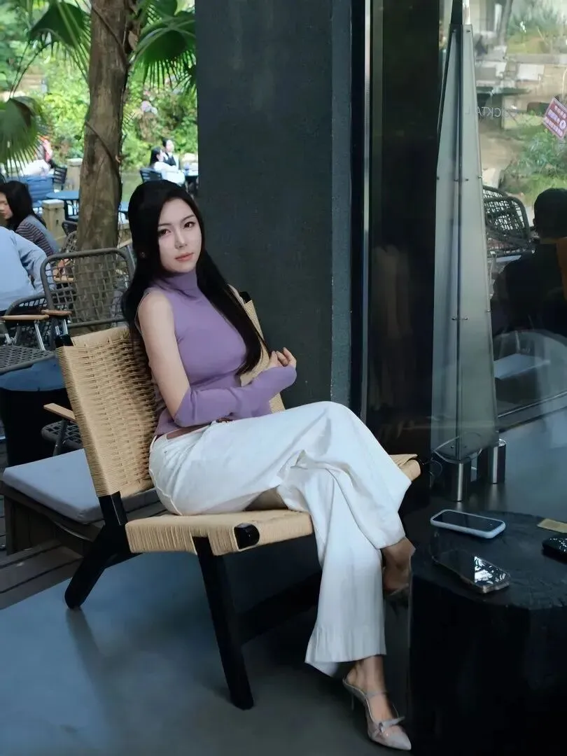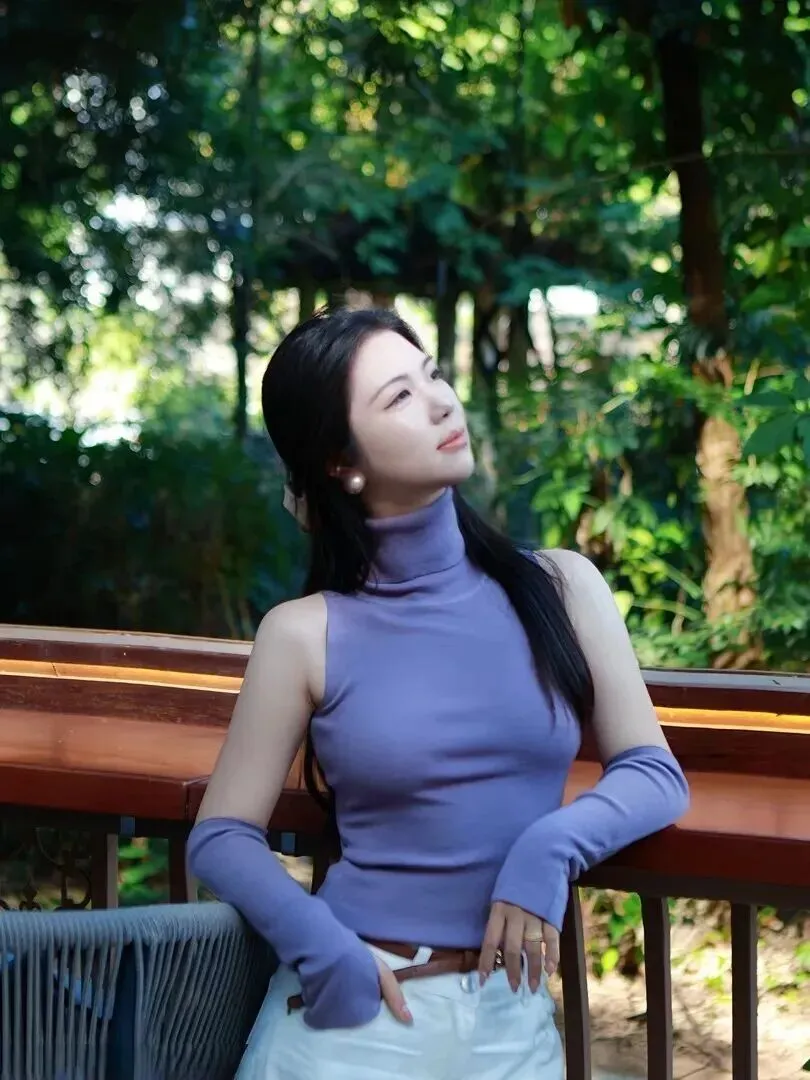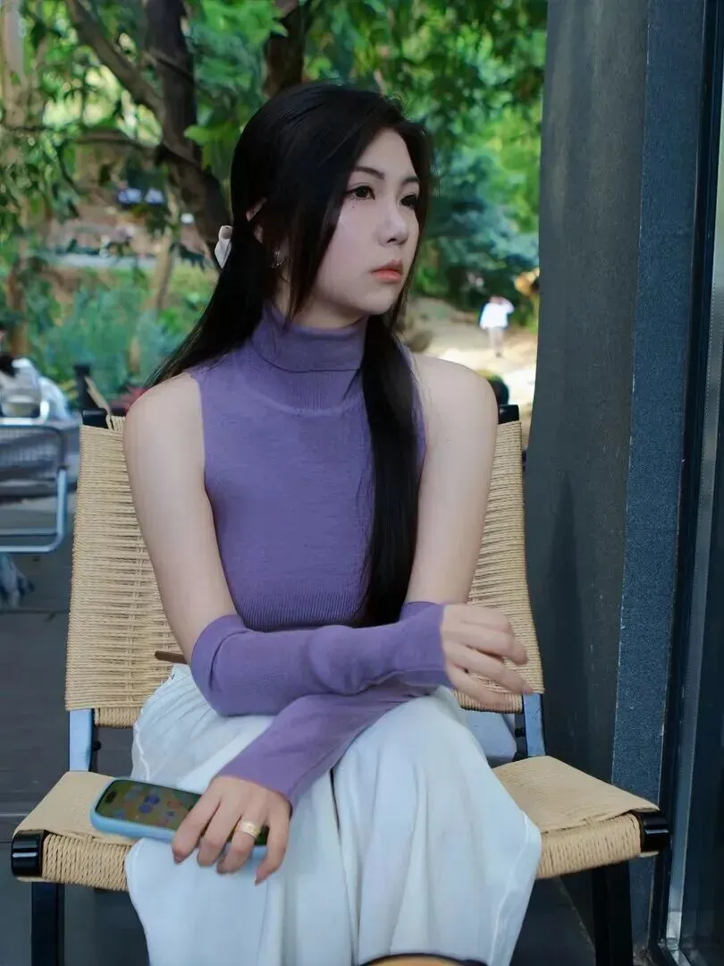 近看上衣纹理更细密,贴身但不显胖。面料弹性好,活动自如。头发黑长直,发尾光滑有光泽,从侧面看过去很治愈。珍珠耳环半露在浅紫色上,两者相得益彰、和谐统一,又不会抢戏,反而让整个造型更精致。