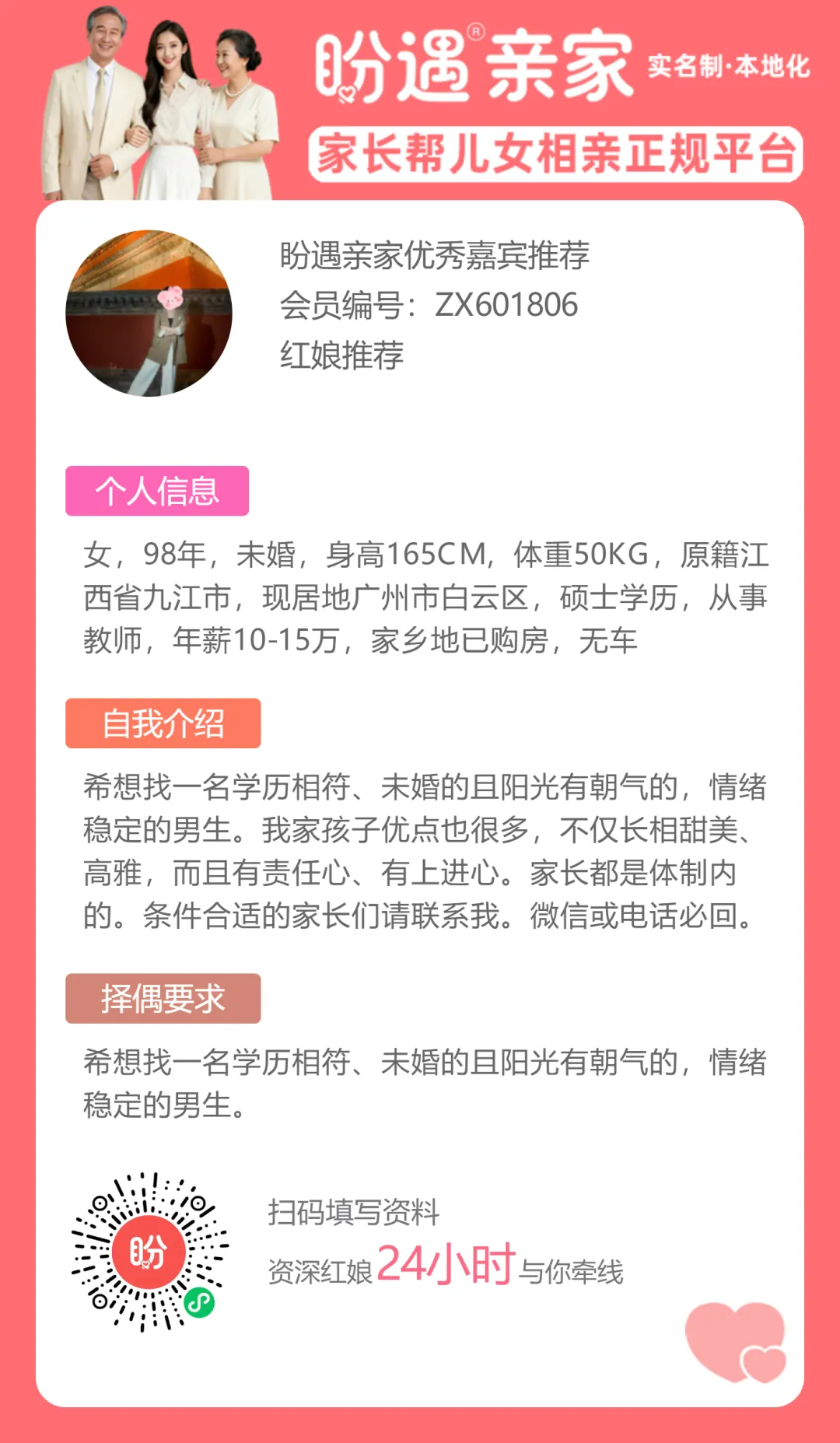当前位置:首页>美女资讯>98年硕士女神,体制内教师+广州定居,盼遇亲家红娘强力推荐!家长速看,24小时牵线不落空!
