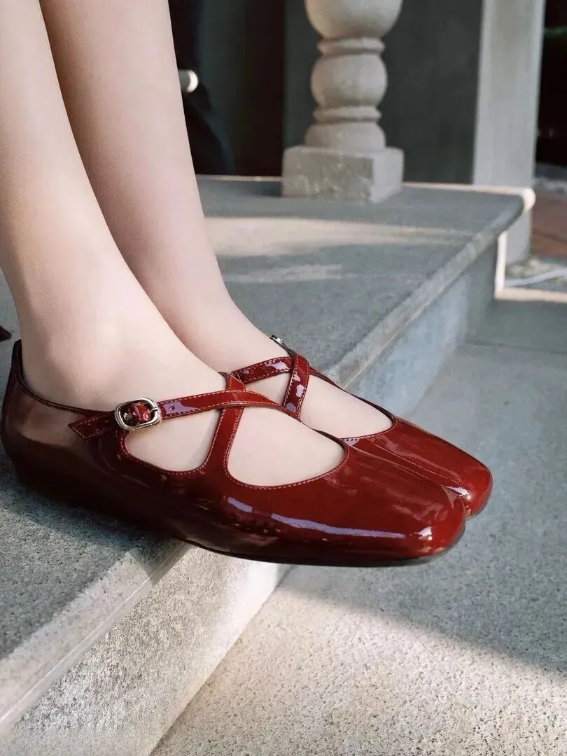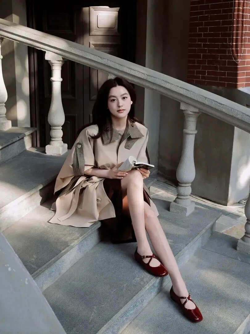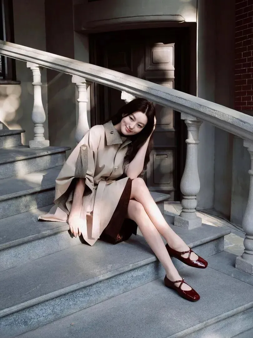 脚上这一双玛丽珍鞋。酒红色的漆皮亮闪闪的,非常显眼。该种鞋子本身就有复古气息,交叉系带设计的可爱又时髦。小姐姐穿上它走路气场非常强、灵动,每一次移动都是时尚的线条。玛丽珍鞋非常百搭,配裙子或者裤子都会使简单的搭配变得精致。说实话,这算不算得上是穿得更美?