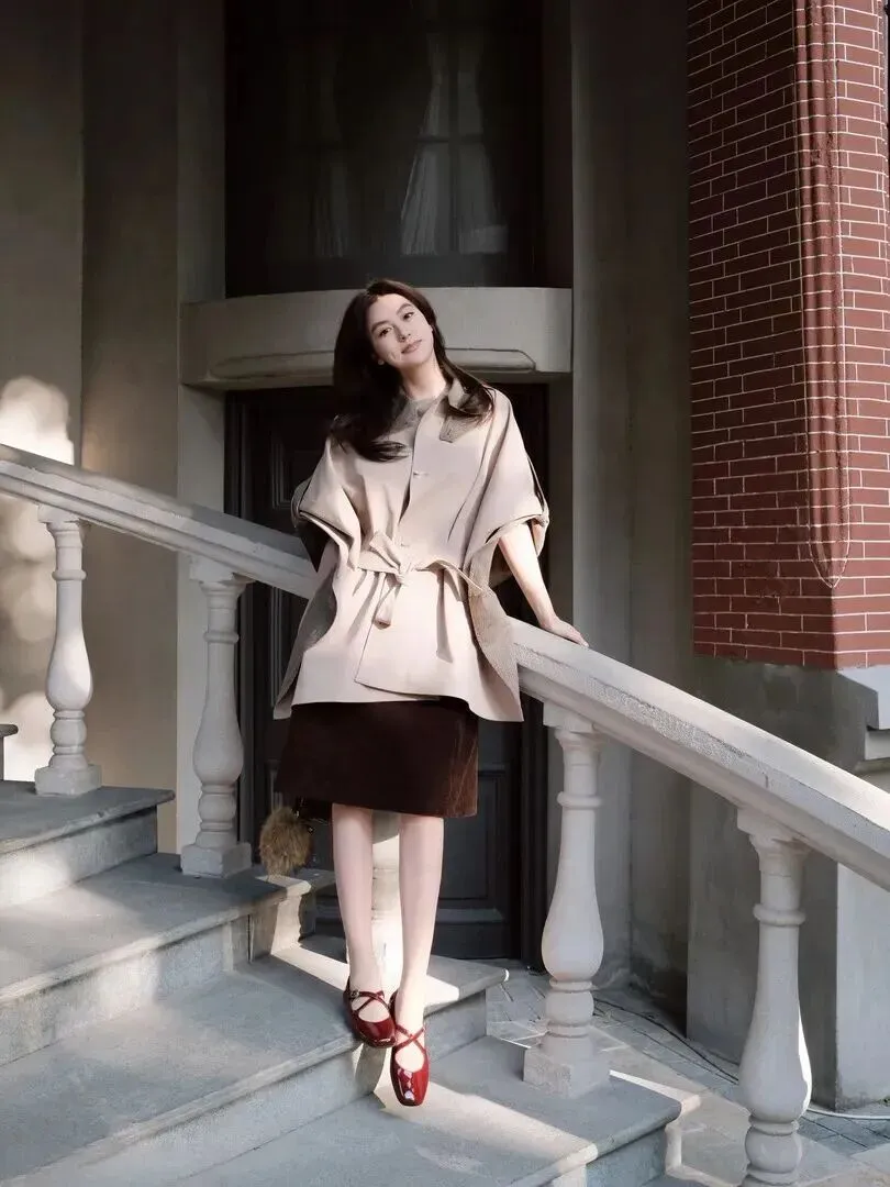 先说风衣。一件卡其色的风衣就是复古穿搭的灵魂,温暖的橙色调给人带来的是秋天那种明亮的感觉,穿上非常舒适。小姐姐一身正式的风衣站在清新的空气里,典雅又有韵味。最妙的是那一块用灰色格纹拼接在一起的图案,使整体多了几分层次,不会过于单调。腰上围了一条细腰带,使腰线更加柔和,使身材曲线更美丽。无论是逛街还是闲坐,穿上风衣就会使气质大为提高。你说经典款是否该人手一件?