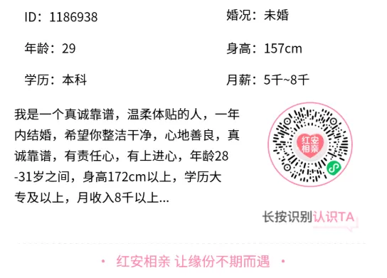 添加红娘微信,回复本期嘉宾ID,红娘一对一牵线,进入“红安相亲小程序”搜索嘉宾ID也可查看更多嘉宾资料。