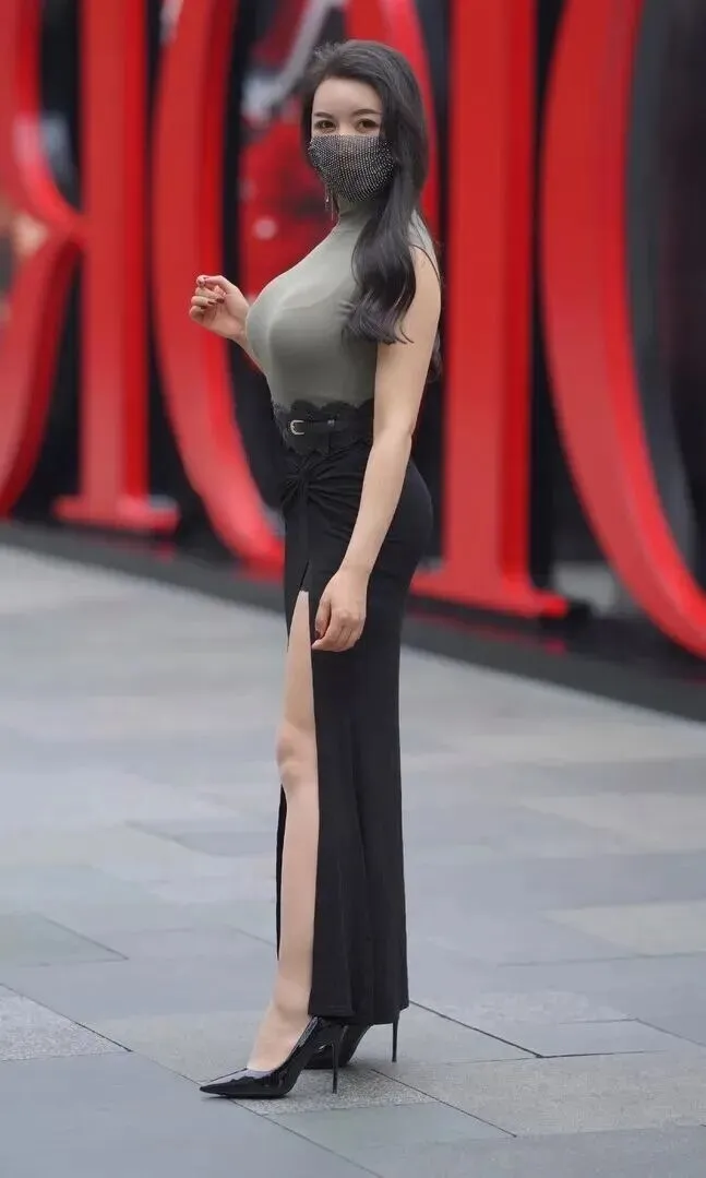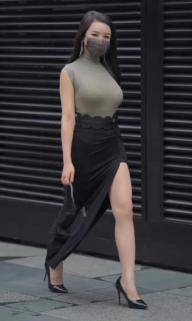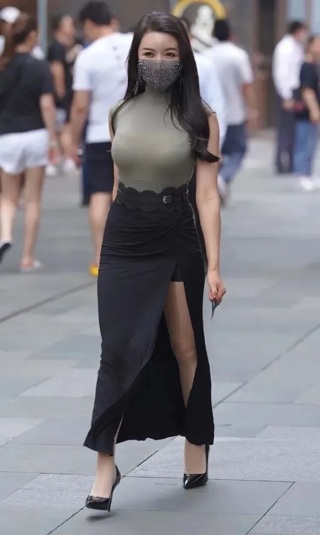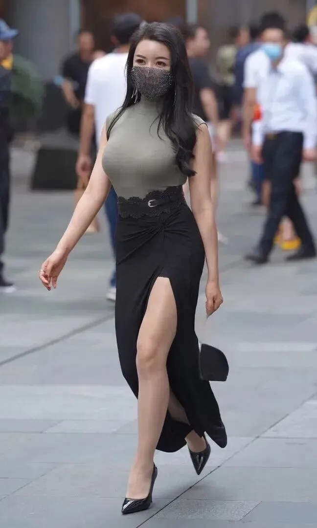配饰方面也十分用心。小姐姐戴水钻口罩很抢眼又很神秘,时尚又含蓄。黑色手提包体积小而漂亮,和裙色的颜色一致。尖头高跟鞋细跟设计,可以拉长腿线条,女人味大增。虽然这些小东西很简单,但是搭配好之后整体质感就大不一样了。