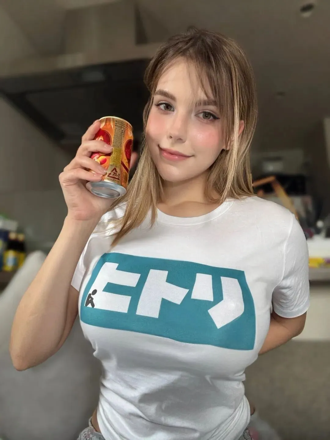 她穿着一套白色比基尼泡在温泉里,手里举着一罐饮料,配合冰天雪地的场景,让人觉得十分有意味。