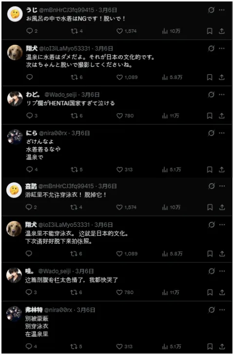 最开始的评论其实还算正常,有网友出来做善意科普:日本的公共温泉有裸浴的习俗,原则上是不能穿泳衣下水的,这是当地长久以来的规矩。本来就是个地域文化的提醒,没什么毛病,可话头刚落,评论区的风向就彻底歪了。