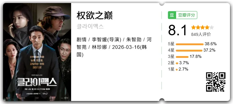 直到2026年,她带着《权欲之巅》杀回来了。豆瓣8.2分,这个分数在今年的韩剧里已经算是"六边形战士"级别的存在。