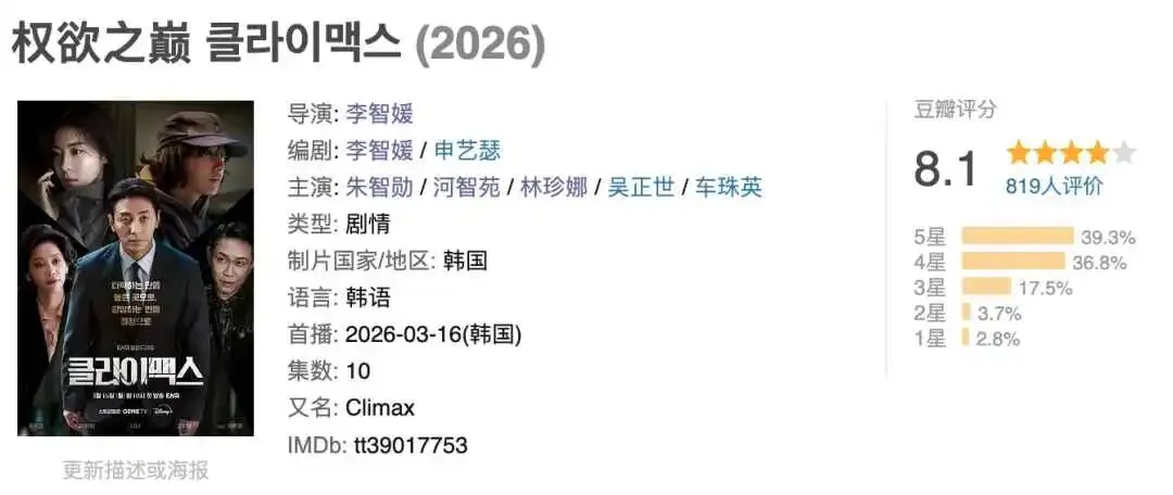 2026年3月16日,《权欲之巅》在ENA电视台播出,开播当天豆瓣评分达到8.2,之后稳定在8.1左右,收视率冲到ENA建台以来第二高,这部剧不是靠打斗或爱情来吸引观众,它展示的是人在权力面前如何一步步被侵蚀。