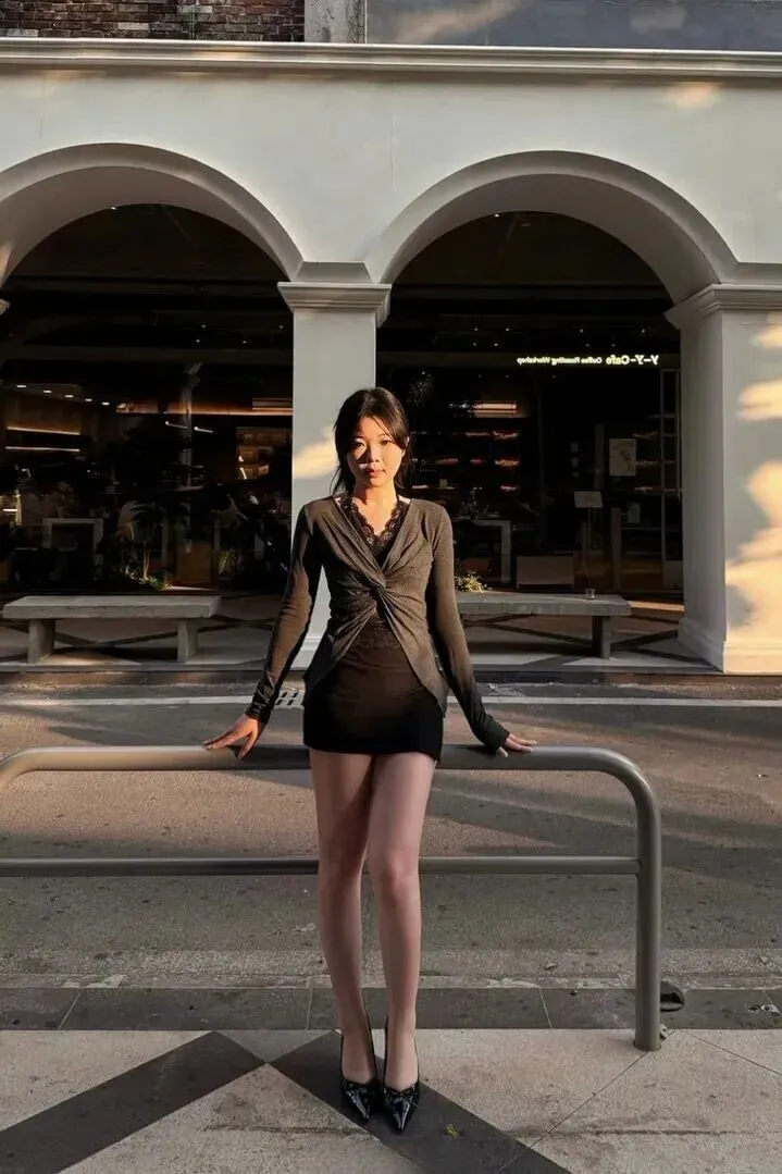 首先说最里面那一件衣服。小姐姐挑的这件浅灰针织开衫很柔软很舒服地贴合着身体,暖暖地包裹住她。最妙的就在于她在里面穿了一件黑色蕾丝内搭。蕾丝若隐若现地,不露锋芒,却有着说不出来的一种女人气。针织衫的前面有交叉打褶的设计,使腰线更细。这样的搭配简单吗?可效果真是绝了,休闲中透着一丝精致。