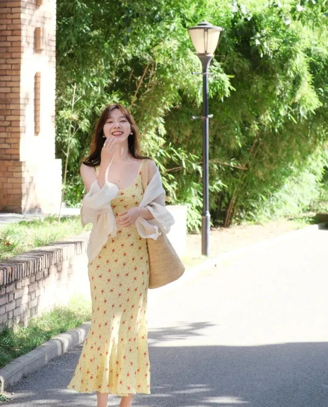 对了 , 还有一个特别俏皮的 , 跨脚站着 , 然后假装要捂嘴笑 , 这个动作真的 , 拍出来好可爱 , 不会僵 , 裙摆在阳光下一晃一晃的 , 少女感直接拉满了好吗!