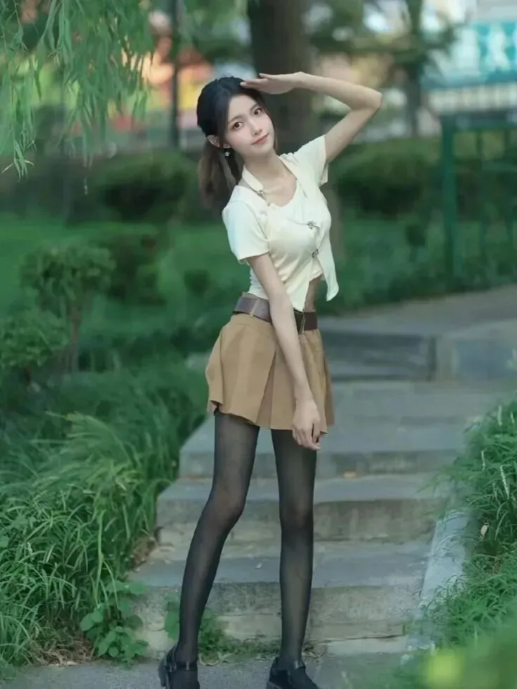 她站在公园台阶上摆成各种各样的可爱的姿势。笑容天然不做作。穿衣打扮再好看,如果人显得僵硬,效果就差了。其自然状态才是最美的地方。