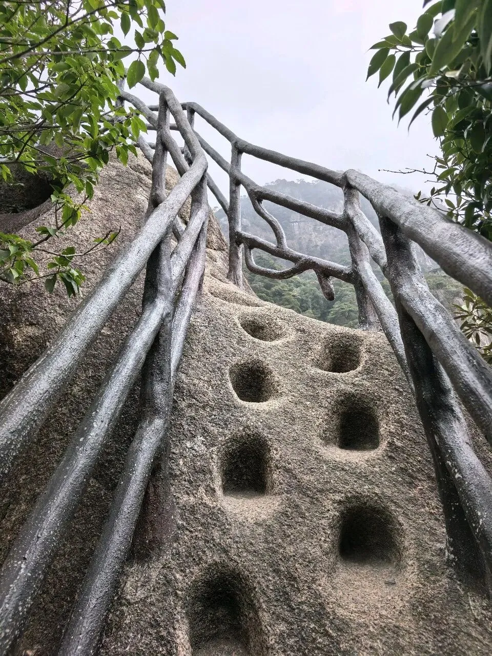 果然很险,前面两个女孩在看着脚的路,没有台阶,只有岩壁上凿出的浅浅脚窝,两侧是仿树枝的栏杆,顺着山势蜿蜒向上。每一步都要踩稳石窝,抬头是遮天的绿叶,低头是深不见底的峡谷。