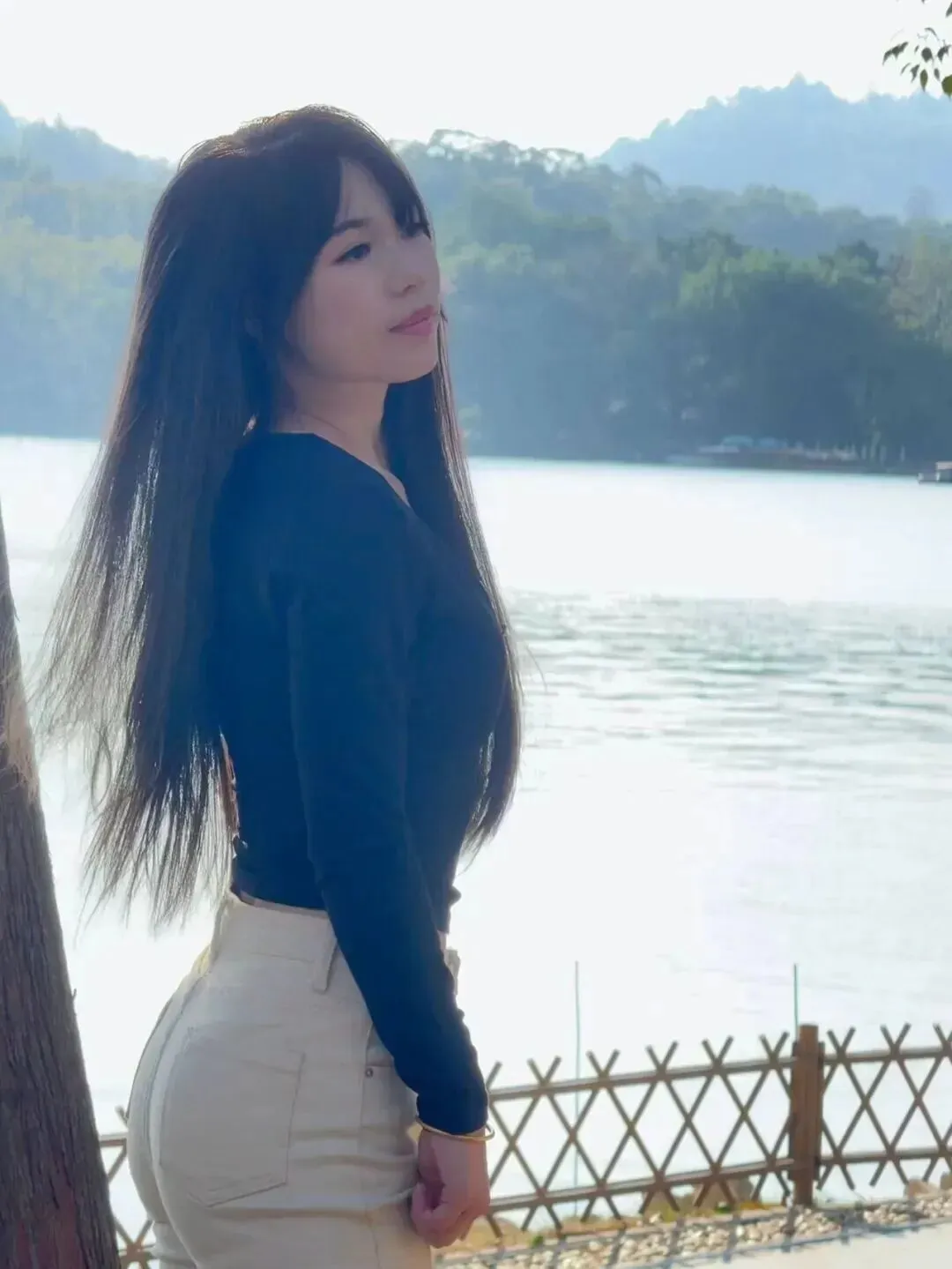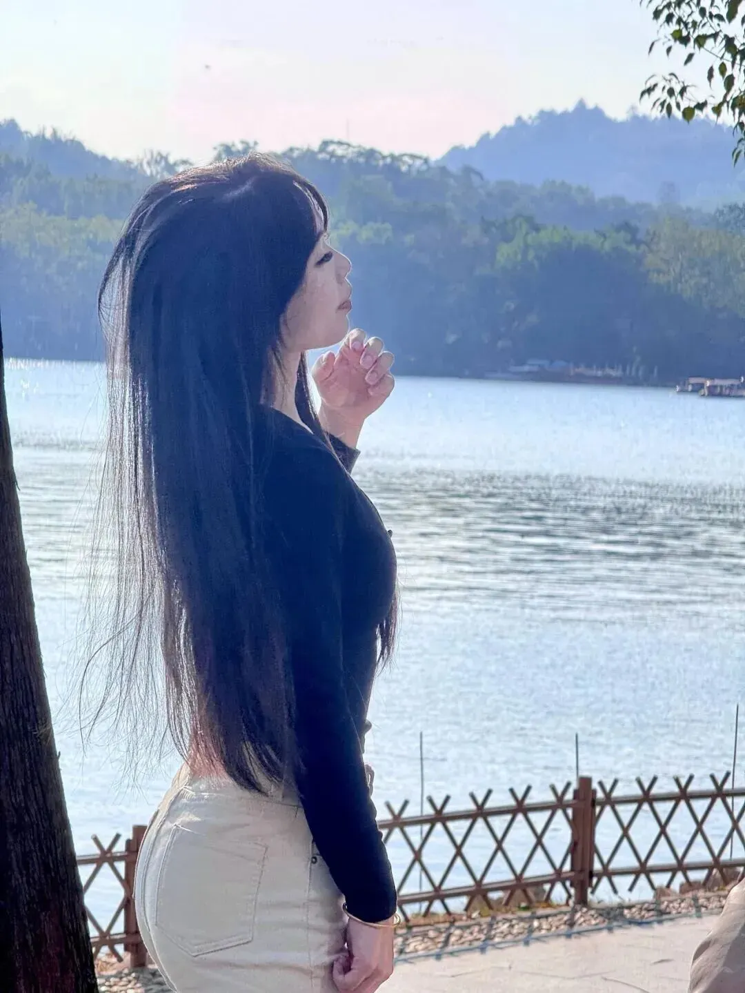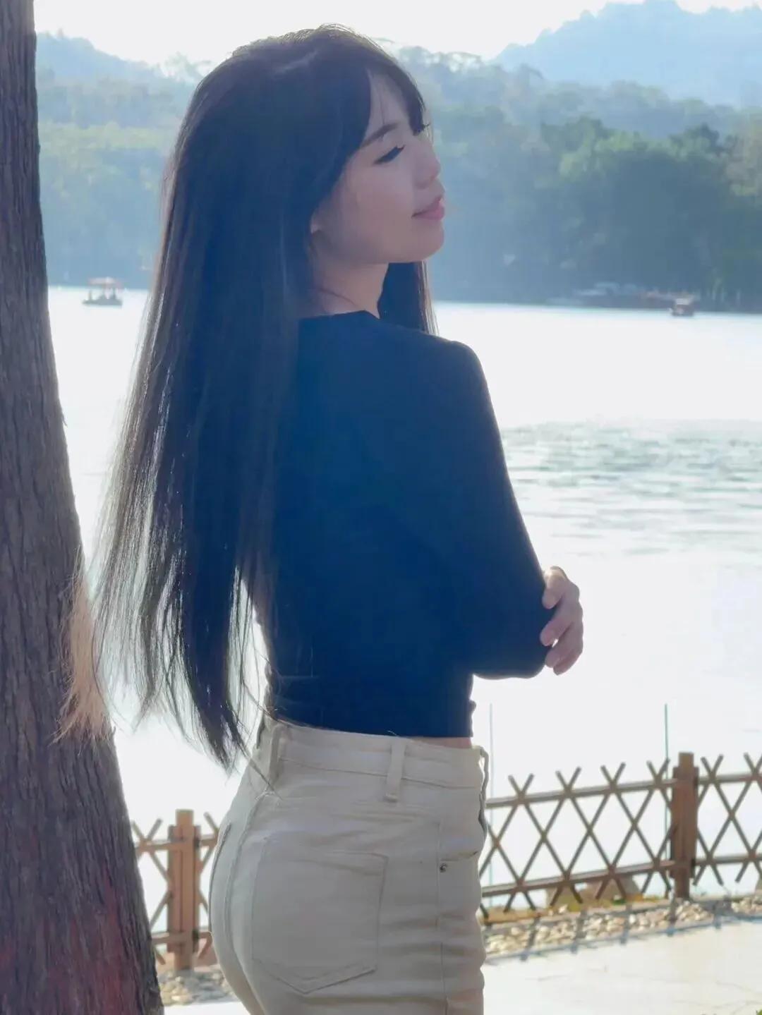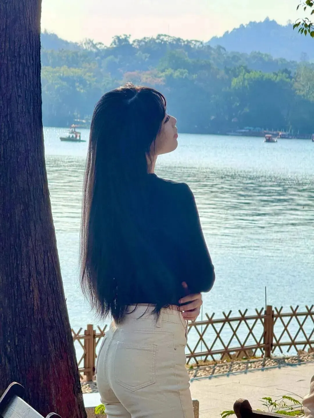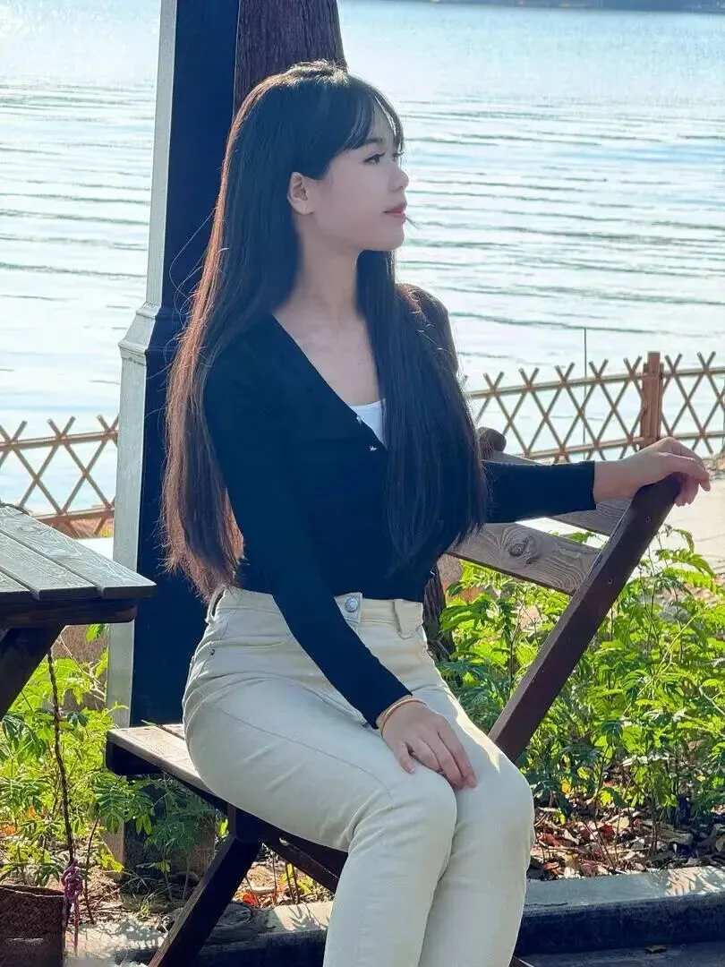 不同地方穿一身,效果一样好。小美女伫立于湖边,受风拂动的长发仿佛与自然融为一体。在长椅上坐着的时候,多了几分懒散的意味,令人看后也想跟随着她一起发呆。