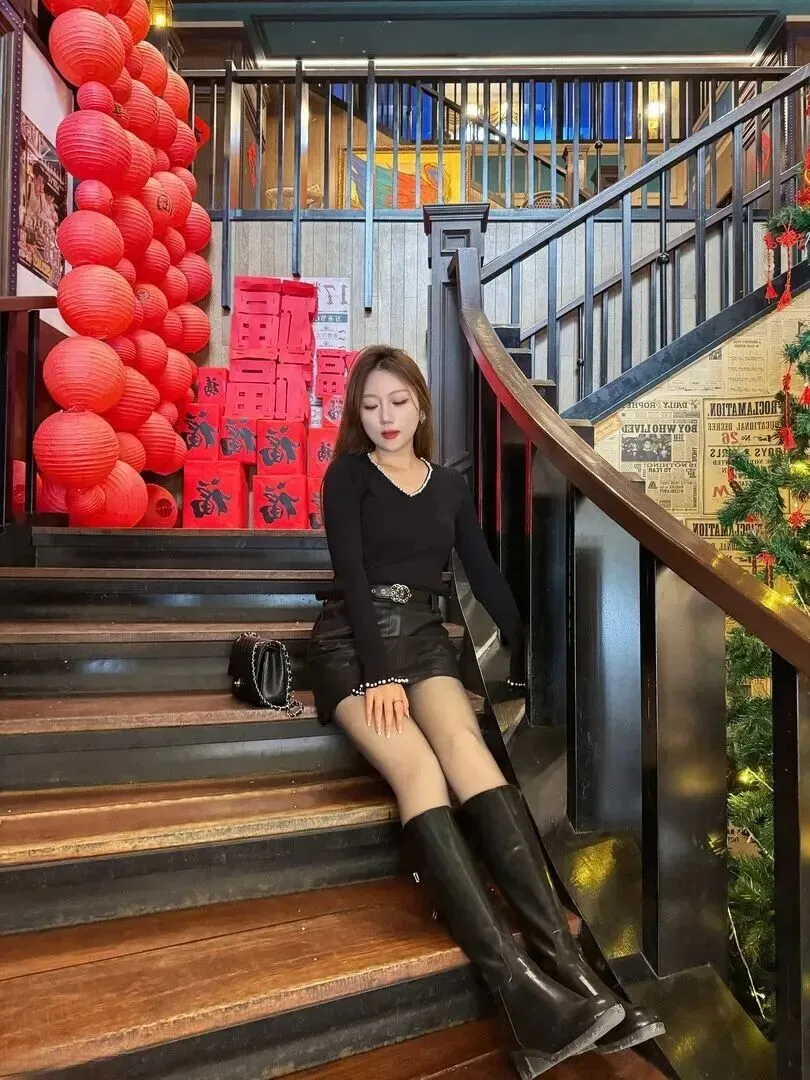 之后就是优雅甜美风。背景超有节日感,女郎穿着一件黑色竖条纹的针织上衣,领口、袖口是白色的珍珠。裙子还是那条皮质短裙,但是整个的质感更加柔软了。深棕色长直发自然垂落,戴一串小耳饰,双手合十。这一套适合聚会或者过节穿着,温柔中带有时尚感,让人眼前一亮。