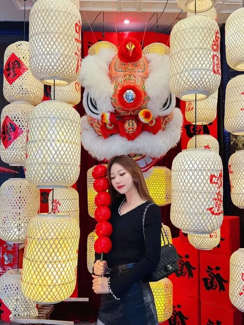 最后就变成了甜美少女风。在新春之际,女郎手持的糖葫芦超可爱!依旧是珍珠点缀的黑色针织衫、皮裙,但是加上了红色的糖葫芦之后,瞬间就活泼了起来。棕褐色长发光滑有光泽,和传统狮头灯笼相比很另类。它适合春节期间串门使用,既有时尚感又有节日气息,很富有童趣。