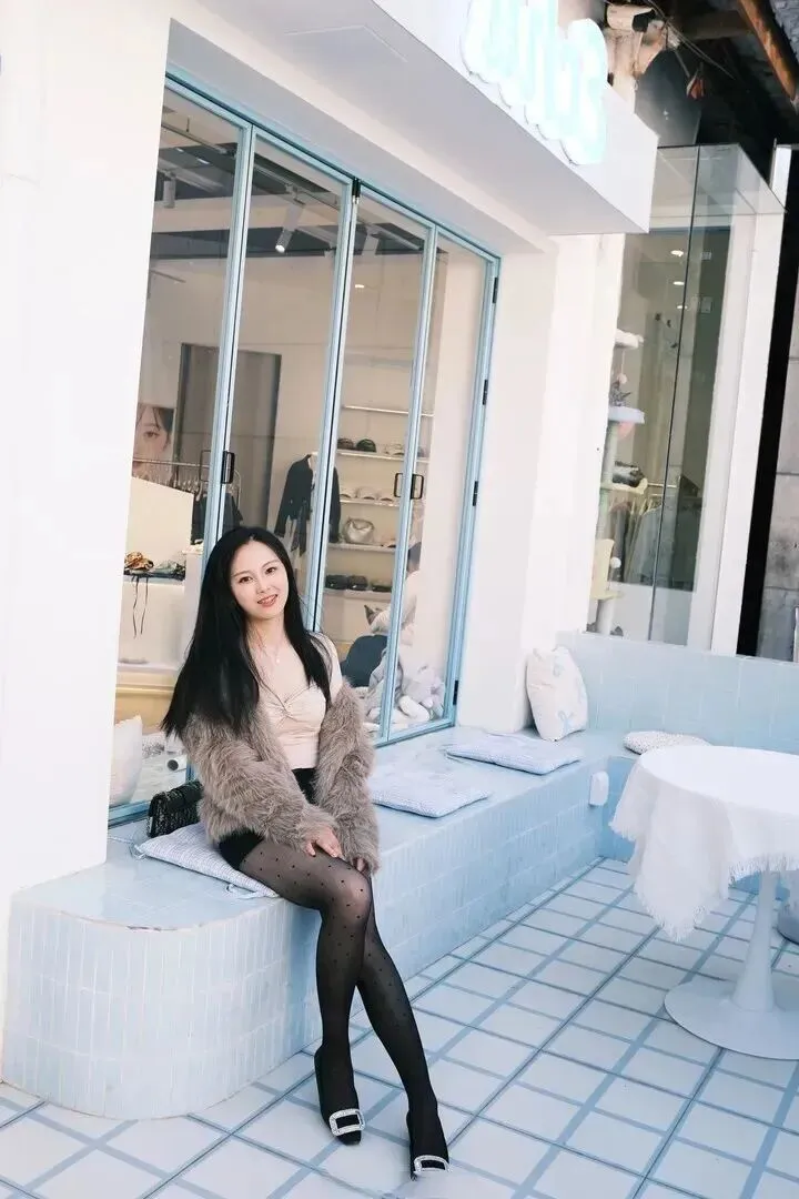 当太阳好的时候,她就倚在白色的集装箱改造过的建筑旁边,瞬间就有了电影感。光线打在了她身上,轮廓是柔和的。那种慵懒随意的气质无处遁形。她的穿着看上去简单,但是每一个单品都在说自己的话。皮草外套贵气、针织吊带温柔、波点丝袜小调皮在一起就是一篇冬天时尚诗歌。