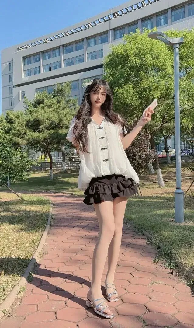 脚背露出来的最聪明的就是穿着凉鞋,小腿高十厘米。头发上系着两个白色的小小发夹,和白T恤颜色一样,不夸张。全身颜色不超过三种,干净整洁,穿戴场合上可以去上课或者逛街。
