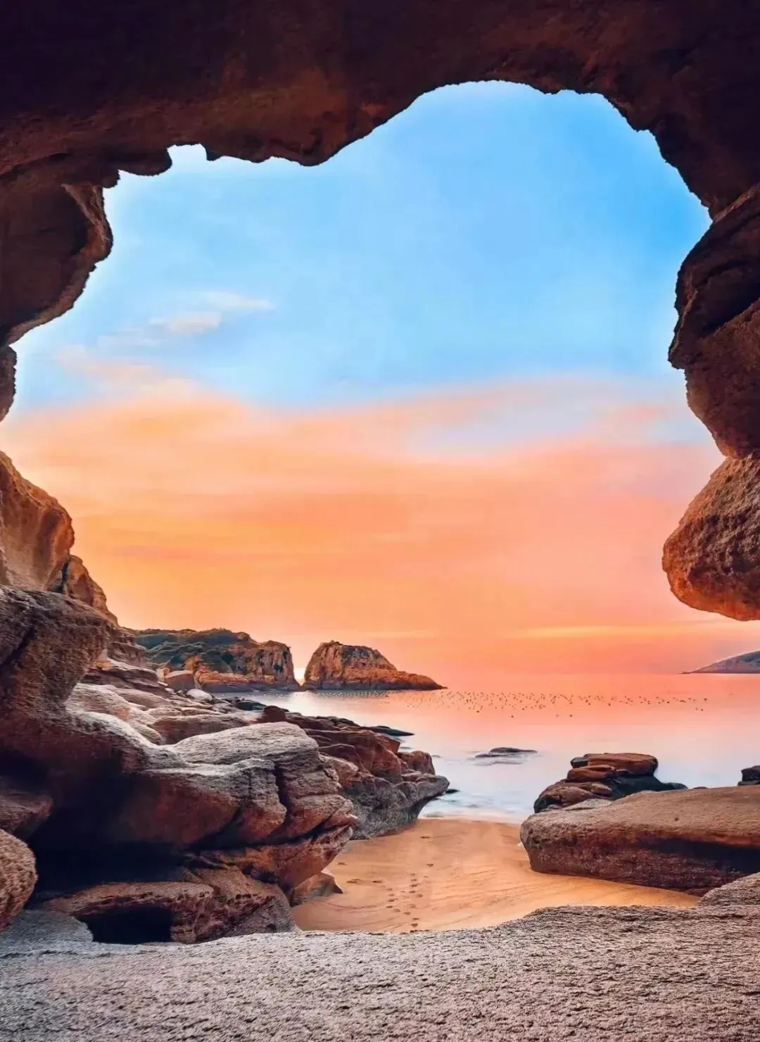 早餐后前往【东海魔界——吕峡下尾岛】下尾半岛东西走向呈长条状直插大海。半岛周边分布着大大小小、形状各异的小岛礁,半岛中部南侧有一小海湾,千百万年的地质构造运动加上海水侵蚀、海浪拍击等外力作用,形成了许多洞穴、奇礁怪石环绕着到整个岸线,潮涨潮落变化无穷,春秋时节的清晨,站在洞穴内向外拍摄,前景沙滩与礁石融合,中景半岛环抱的海湾,远景一轮红日从山崖口冉冉升起。这里的海水清澈湛蓝,这里的礁石千姿百态,这里的沙滩晶莹剔透,是拍摄海礁日岀、风光人像、慢门海浪等各种拍摄手法的绝佳地上。