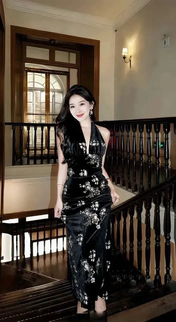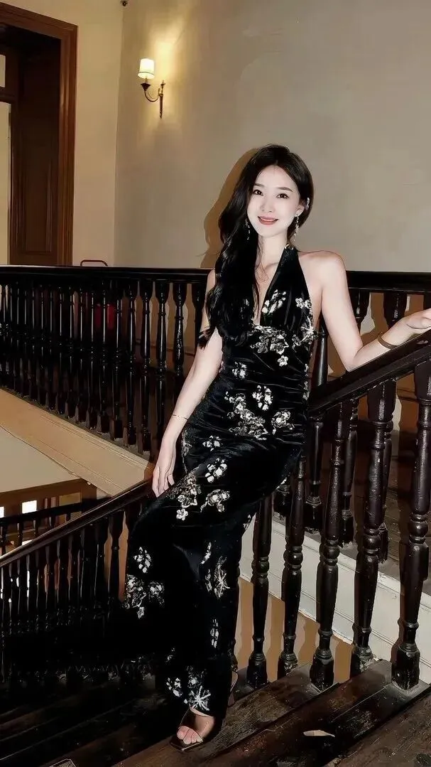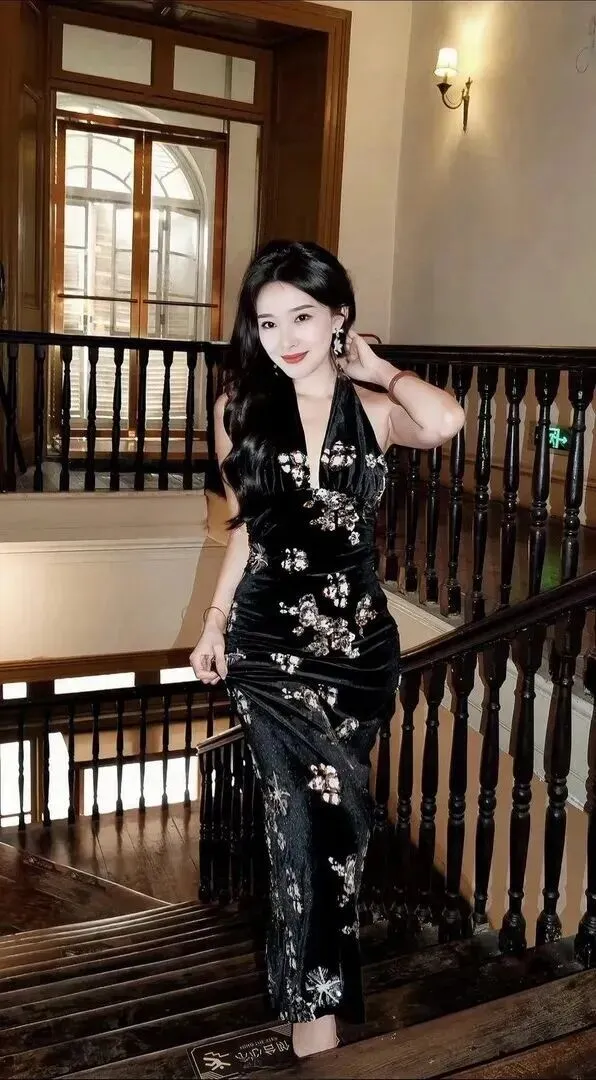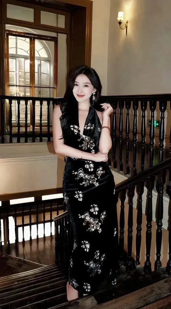 走进一间复古感十足的室内楼梯间,小姐姐气质就变得不一样了。深棕色的木质楼梯上身穿的是黑丝绒旗袍改良款式,既有稳重大气又不失风度。裙子上绣有银白色亮片花朵,从胸到裙摆,十分华丽。