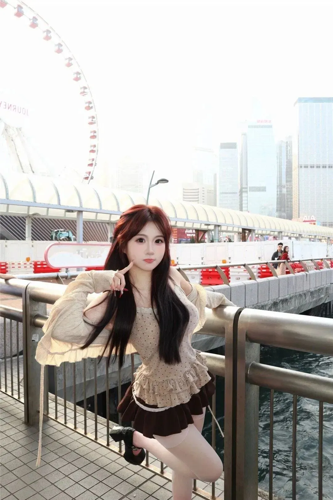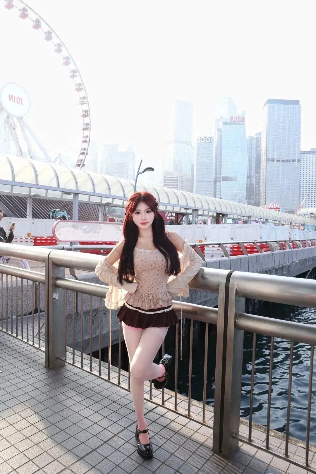 该种搭配很适合拍照,在滨水区、老街巷都可以出片。坐着栏杆之处,背景是耸立云端的摩天轮,懒散的城市人。