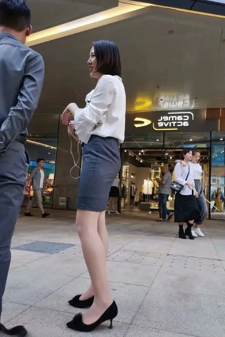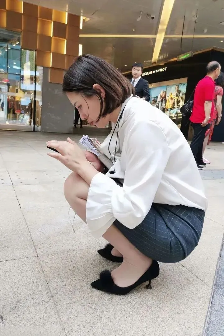 穿得好不如穿得有自信。小姐姐在街拍中的姿势是低头在手机上,低头的时候是高度聚集的状态,微笑的时候则是比较放松的状态。蹲下整理东西的时候,也很自然。职场穿搭不是衣服,是态度。穿上这身衣服走起路来风度翩翩。