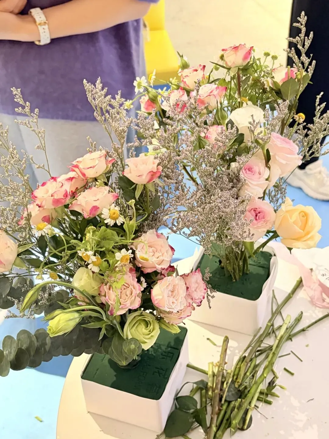 花艺体验格外受欢迎,活动刚开始便人气高涨。现场早已备好浸润的花泥,大家随心挑选喜爱的花材:娇艳的玫瑰、温婉的康乃馨、雅致的洋桔梗,在一花一叶的搭配间,亲手创作属于自己的独特花艺作品。