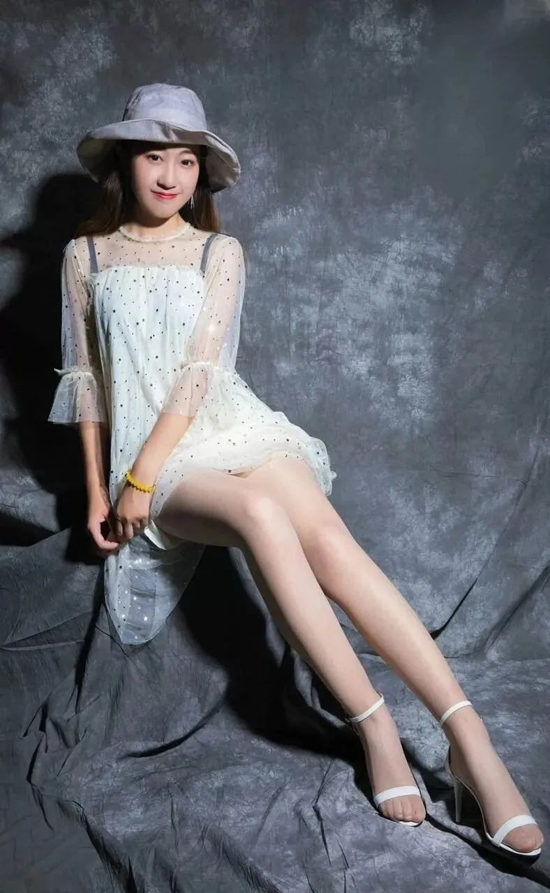 丝袜并非只有“肉色”一种。根据拍摄主题,足模会选用偏粉、偏黄或偏灰的色调。图中模特的丝袜属于“中性肉色”,在灰色背景与白色裙装的衬托下,既不抢镜,又能自然过渡肤色,是典型的“视觉缓冲”技巧。