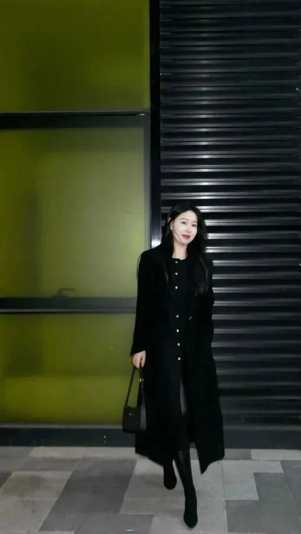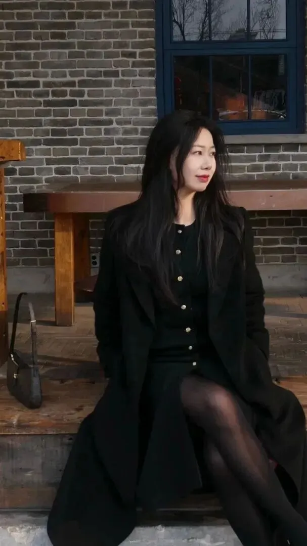 由图可知该女子穿着黑色毛呢大衣,外面是一件带有针织套裙的长款毛呢外套,在复古砖墙旁站着。她双手插兜,看起来很随意,但是那份从容却立即显露出来。高级感不是硬挤出来的,而是自然而然的。黑色在这里就充当着她的背景板角色,使得她整个人都变得飒气而又柔情起来。