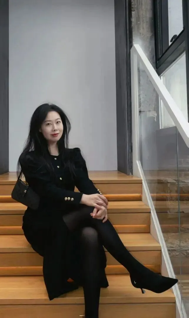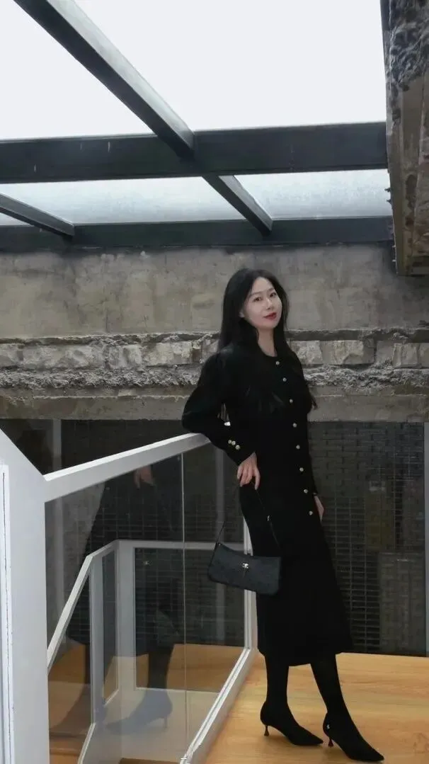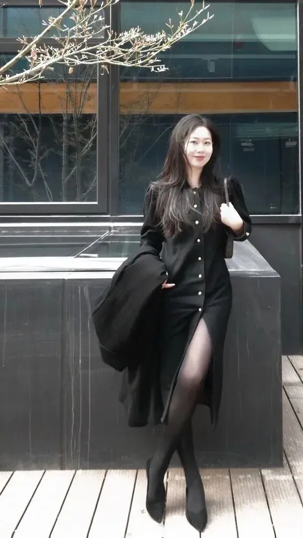 同样的黑色大衣,在不同的地方穿着就会产生完全不同的感觉。她坐在一个古老的书店门前,用银灰色的折叠椅当道具。脚上穿黑色的细高跟,使身姿显得更挺拔一些。黑色在这里不抢戏,却把氛围感拉满。你会发现黑色适应各种场合的穿衣风格都可以穿出不俗的效果。