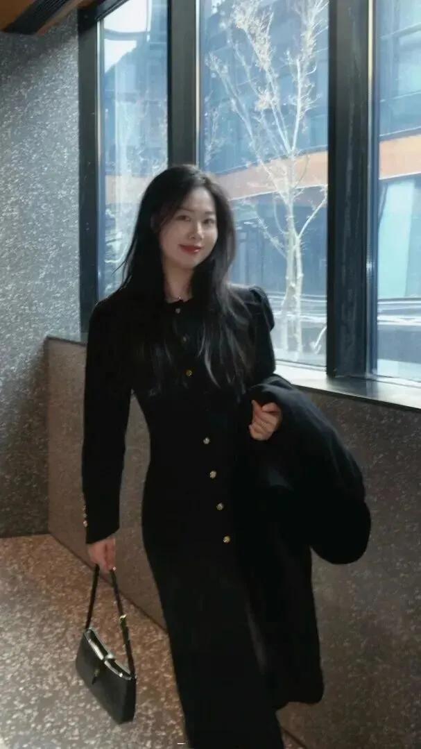这条黑色的衬衫连衣裙腰部收紧正好,领口用金色的丝线装饰,一直延伸到裙摆处才出现一丝巧思。开叉+透明丝袜,层次感一下子出来了。带着皮包,穿着外套,像是刚刚从聚会上出来一样,有浓浓的慵懒之气却带有精致的气息。