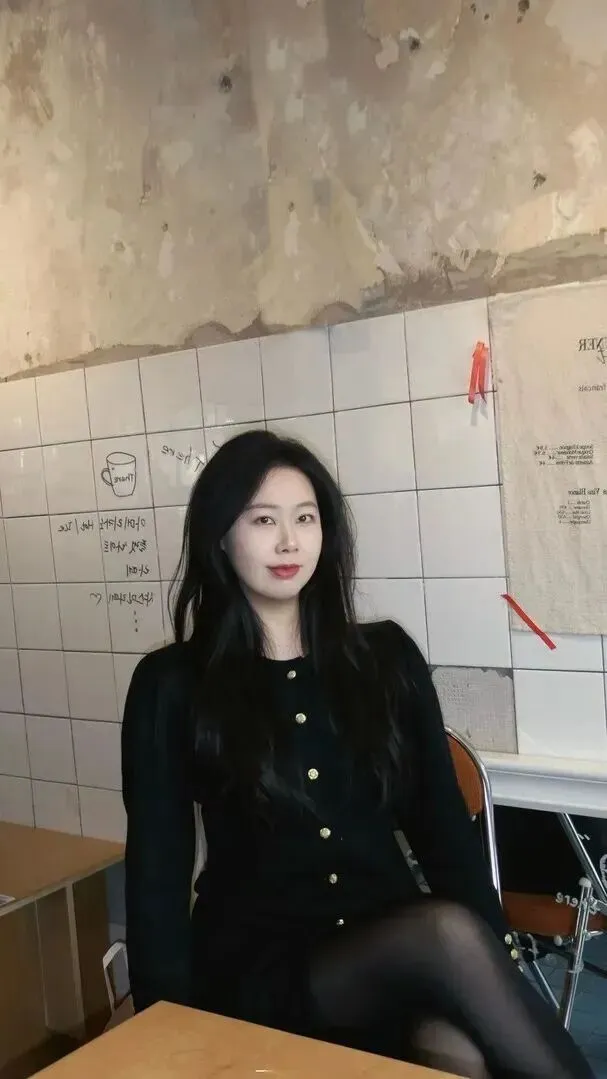 斑驳的墙、咖啡杯纸条、韩文标签这些就组成了复古咖啡馆特有的氛围。穿黑色皮裤、黑色丝袜坐在棕色皮椅子上就是这位老板的消遣时光。黑色穿搭就这样融入了日常生活当中,毫不显眼。