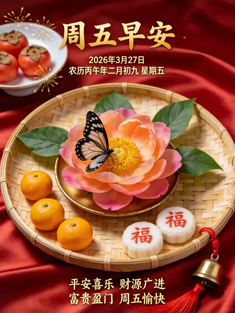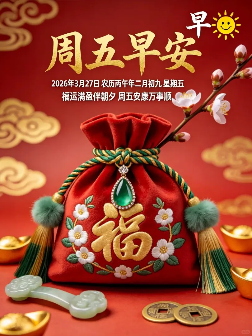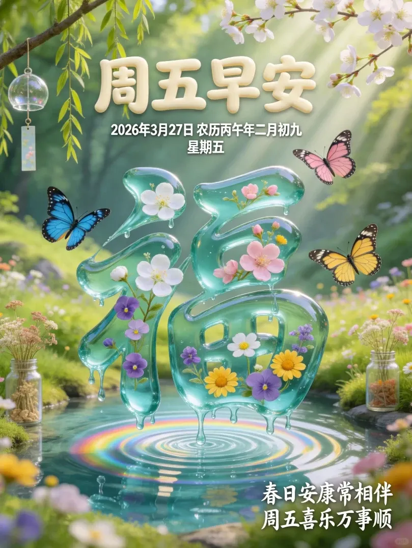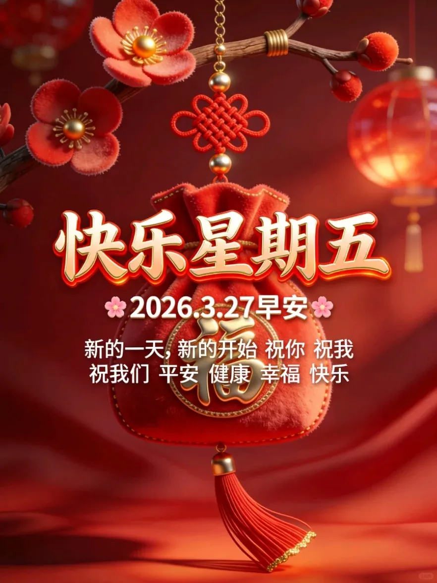 1. 🌞早安,今天是2026年3月27日周五。终于盼到周五啦,不用紧绷,不用焦虑,把工作好好收尾,把心情慢慢放松。愿你这一天顺顺利利,少点忙碌,多点轻松,笑容常挂脸上,烦恼统统靠边站,平安喜乐,开开心心迎接周末。