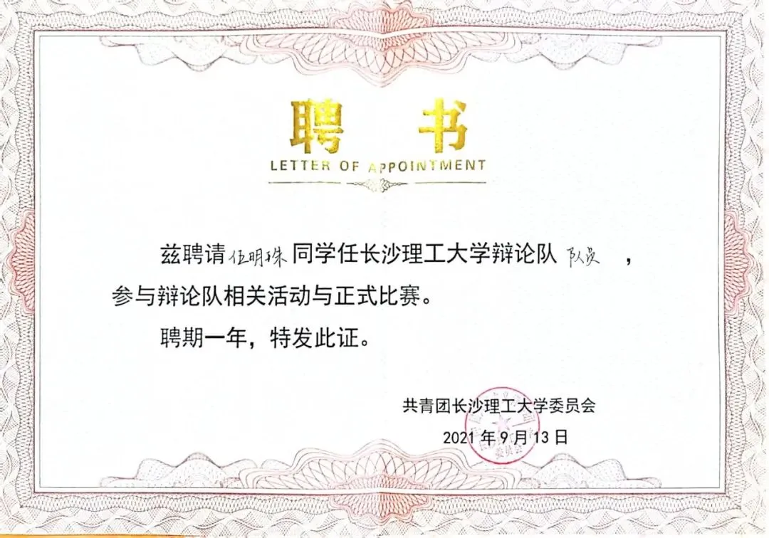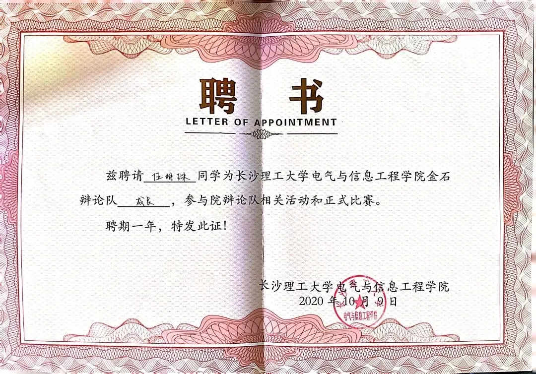 ▲上图分别为金石辩论队聘书与校辩论队聘书