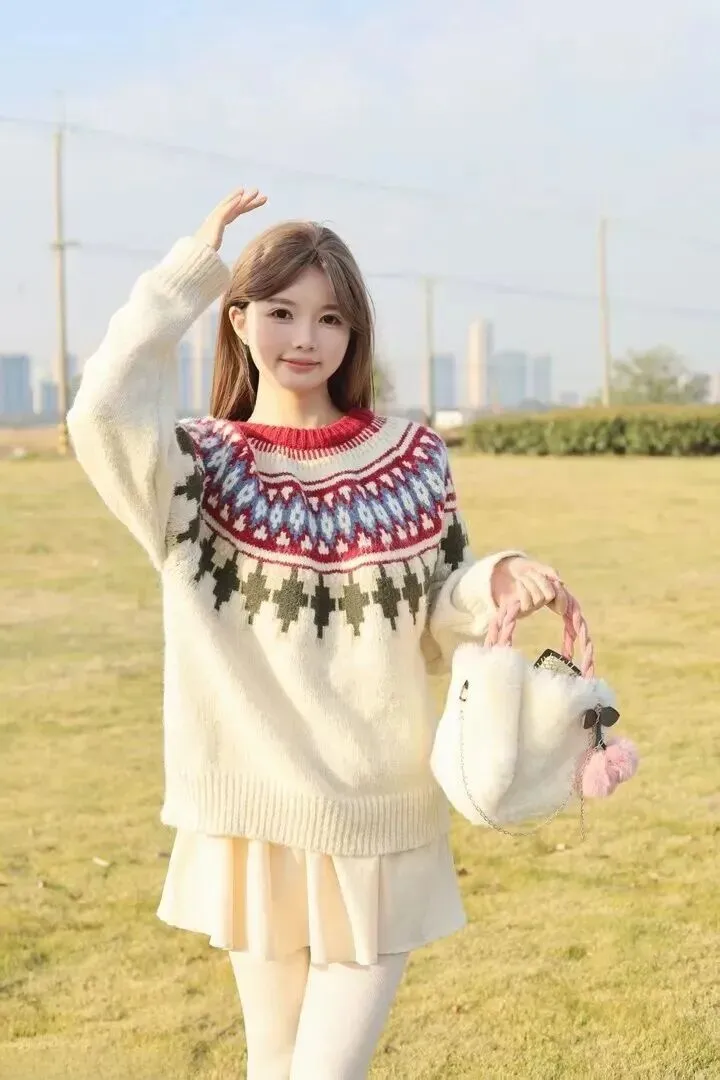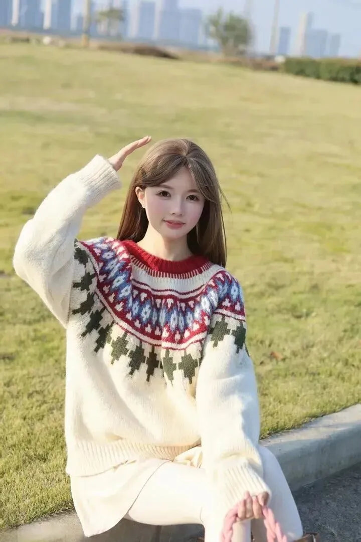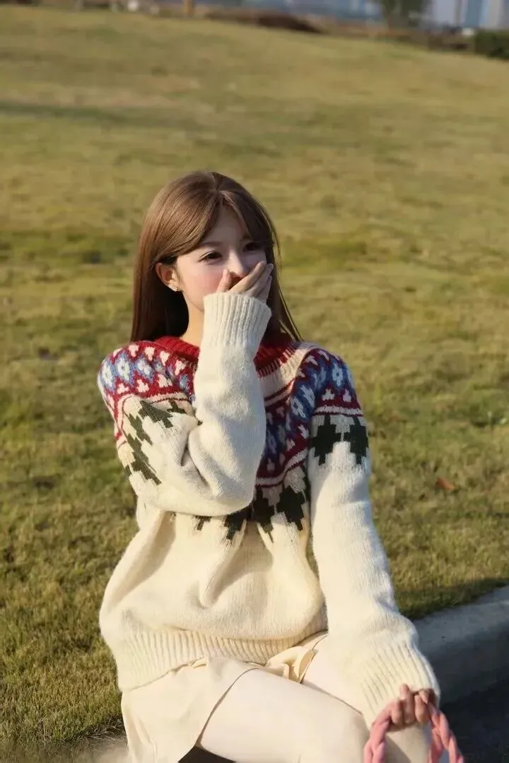 细节上也花了很多心思。领口有一点点酒红色的点缀,立马把毛衣亮了起来。胸前有几何花纹、手臂上带有小图案,带着复古民族风的简单毛衣便有了不一样的感觉。平时穿的时候,把衣角稍稍塞进裤子里,立即就会使腿部看上去更长一些、个子更高一些。