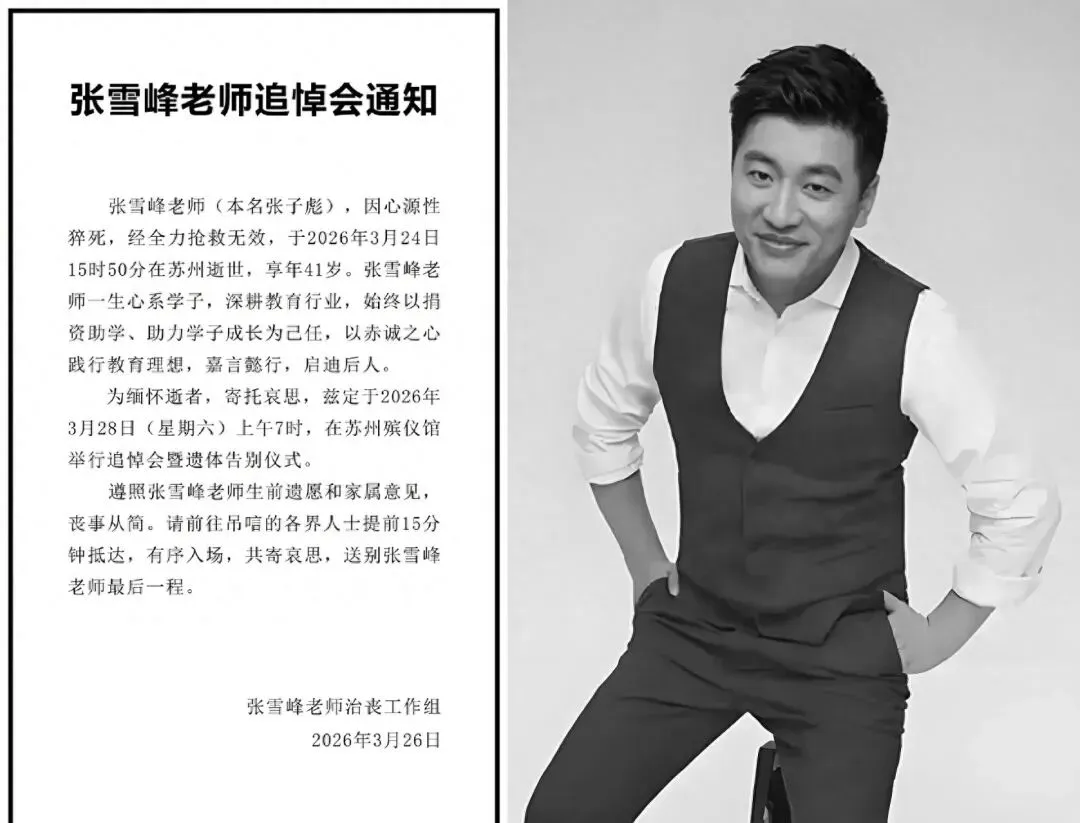 3月24日,网红名师张雪峰不幸猝逝,将生命永远定格在42岁,日前,张雪峰名下的峰学蔚来公司已经对外发布讣告,其中提到张雪峰的去世原因是心源性猝死,其告别仪式定于3月28日上午7点。