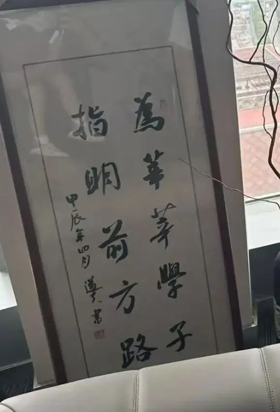 浅色皮质沙发看上去干净整洁,沙发的空隙处还摆放着一幅字作,上面写着“为莘莘学子,指明前方路”几个大字,这无疑也是张雪峰一直所信奉的人生信条。