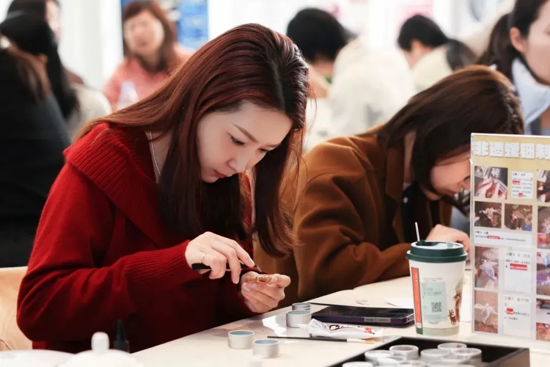 活动现场,女性职工们化身巧手匠人,选贝片、镶嵌、打磨......指尖流转间,一个个造型精致、光泽灵动的螺钿作品渐渐成型。