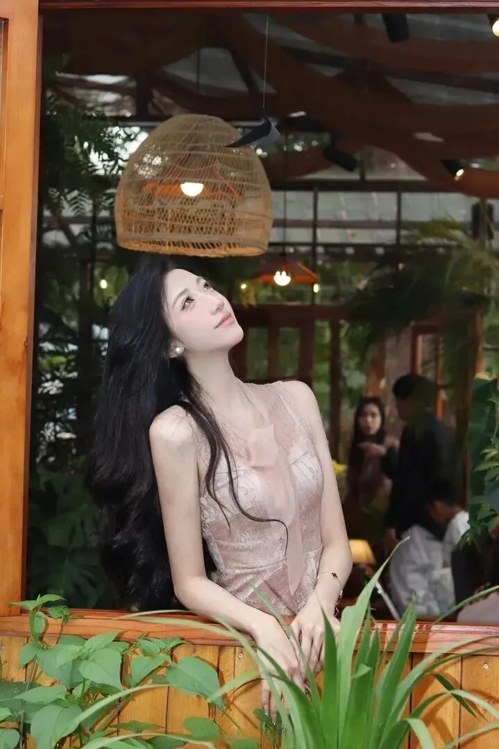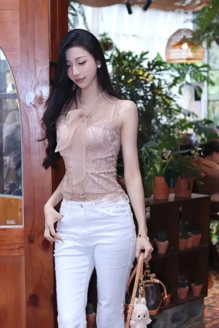 就像这位小姐姐示范的那样,一件无袖裸粉色蕾丝上衣,随便一穿就很有高级感。蕾丝纹理若有若无,领口系有薄纱飘带,随意一穿就显得十分飘逸。坐在咖啡馆里,阳光照射在身上,整个身体有一种发亮的感觉。