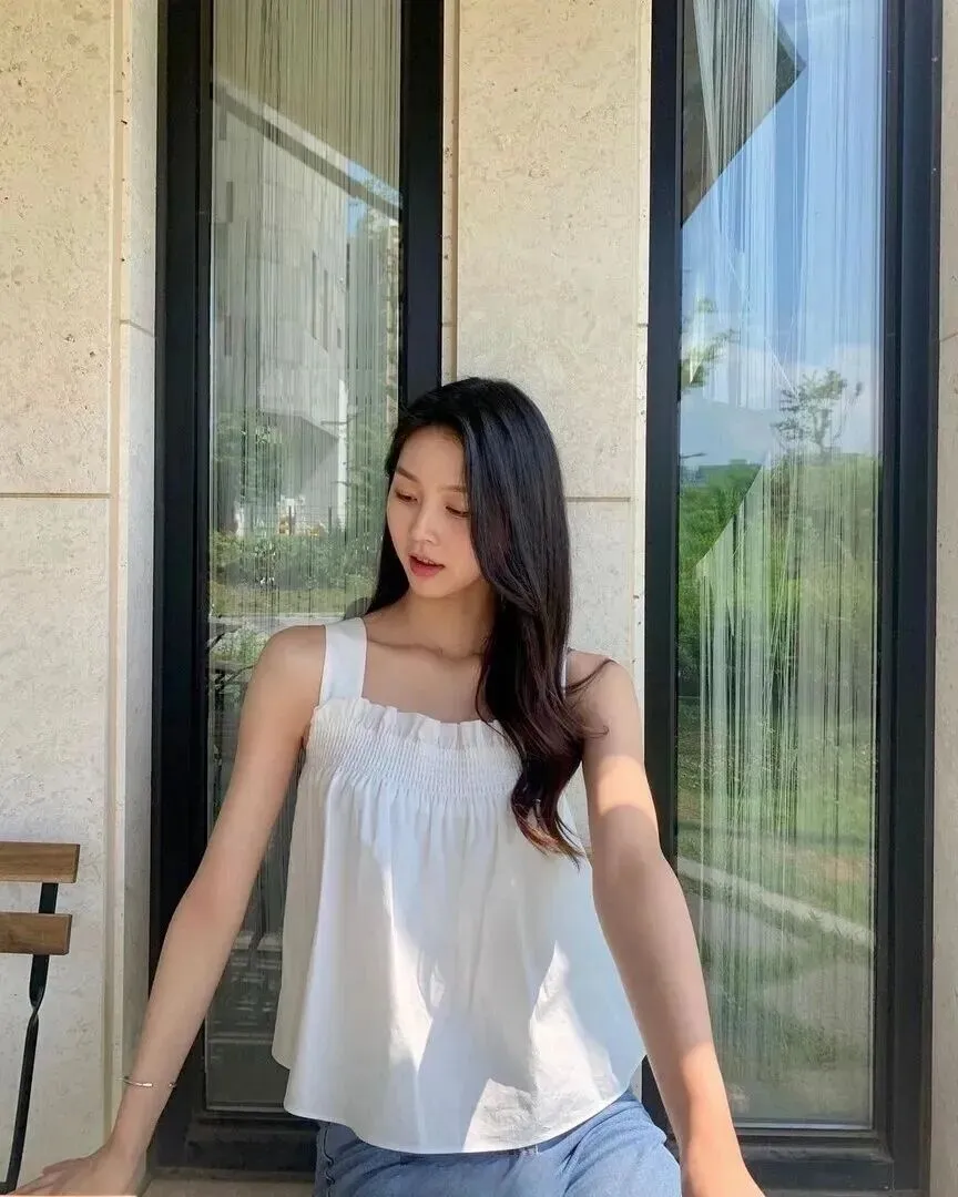 白色吊带给夏季标配!一件就可表现出干净清爽的感觉。小姐姐身上一件无袖吊带的领口做了点褶皱花边处理,顿时就多了一份甜美的感觉。尽管它设计简单,但是穿上之后立刻改善了自己的气质,丝毫没有单调感。