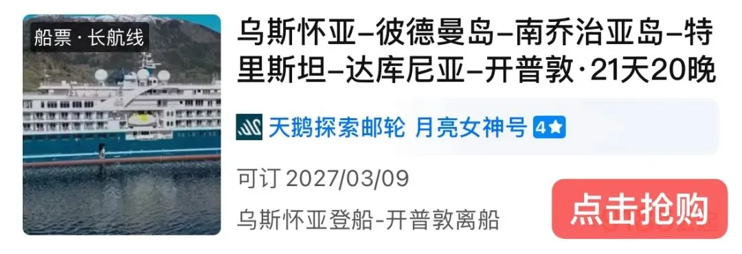 这一班期在明年3月出发,21天深度跨洋远征,串联南极至南非核心秘境,3月南极晚夏冰景澄澈,非常适合解锁常规航线难及的特里斯坦-达库尼亚,体验沉浸式极地探险。